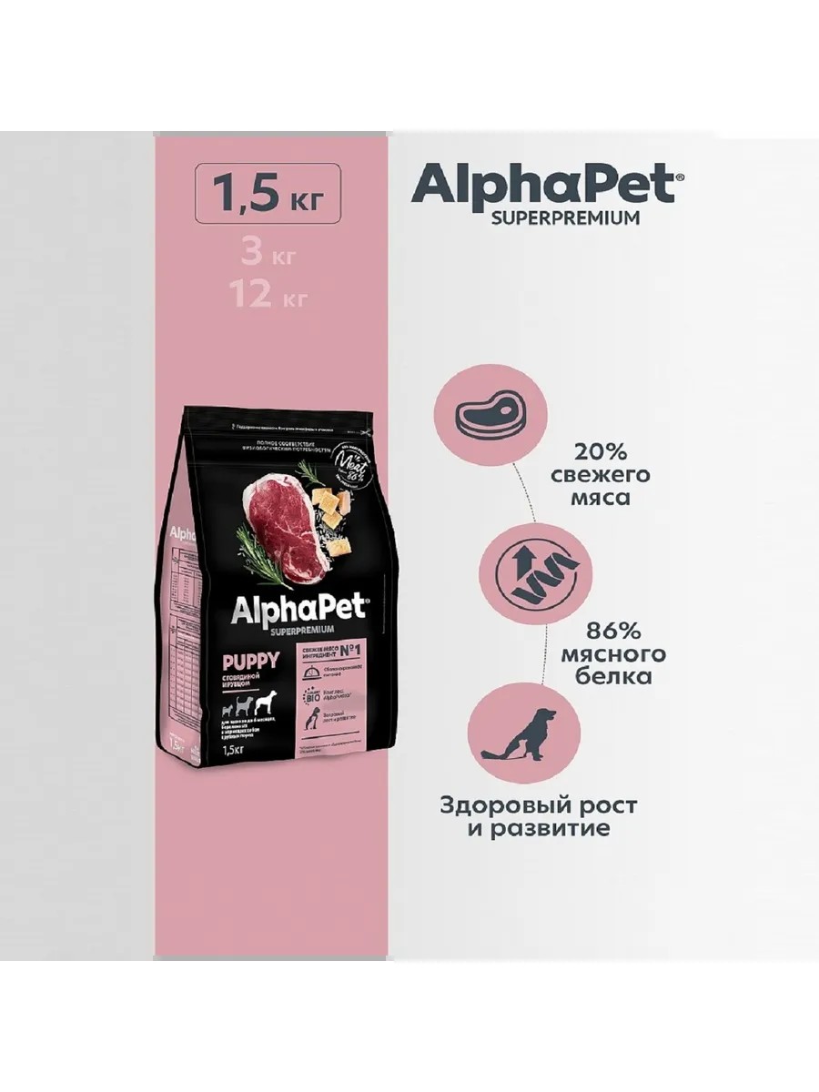 AlphaPet SUPERPREMIUM крупным щенкам до полугода Говядина, рубец1,5кг