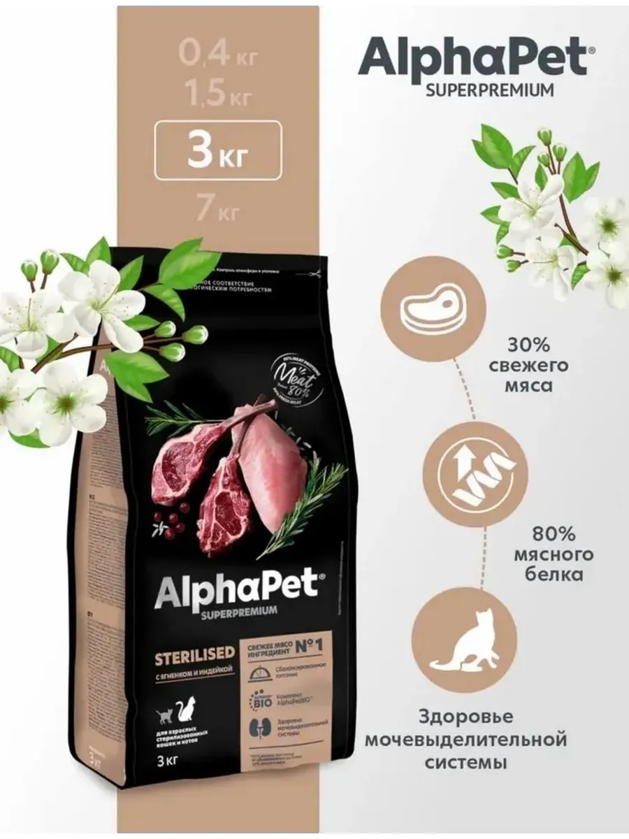 Корм для кошек сухой с натуральным свежим мясом индейки и потрошками. Кошачий корм разработан под брендом AlphaPet Superpremium для взрослых кошек и котов после стерилизации. Сухой корм для кошек соответствует максимально их физиологическим потребностям. Корм для кошек АльфаПет Суперпремиум содержит в составе 76% мясного белка высокого качества, с низким содержанием жира. Для производства премиум корма для кошек применяется свежее мясо. Баланс магния, фосфора и калия для здоровья мочеполовой системы. Зоотовары для кошек АльфаПет WOW Суперпремиум сохраняют питательные свойства свежего мяса. Корм сухой для кошек создан российской компанией по оригинальной швейцарской технологии, позволяющей включать свежее мясо в состав. Зоотовары для кошек уменьшают риск развития мочекаменной болезни. Производитель не использует в составе премиум корма для кошек ГМО, консерванты и искусственные красители, а также ароматизаторы. Состав: мясные ингредиенты 44,5%, в том числе свежее мясо 10% (индейка, свиные субпродукты), дегидрированное мясо домашней птицы 32%, пшеница, рис 15%, сушеная мякоть сахарной свеклы, животный жир, гидролизованная куриная печень, желтый горошек, витаминно-минеральная смесь, пивные дрожжи, рыбий жир, комплекс AlphaPetBIO (зеленогубый моллюск, календула, одуванчик, льняное семя, цикорий, клюква, Юкка Шидигера, розмарин), таурин, DL-метионин, антиоксидант. Минеральные вещества: магний - 0,08 %, медь - 6 мг/кг, железо - 84 мг/кг, марганец - 6,9 мг/кг , цинк - 180 мг/кг , йод - 1,4 мг/кг, селен - 350 мкг/кг, таурин - 1 277 мг/кг, витамин А - 15 000 МЕ/кг, витамин D - 1200 МЕ/кг, витамин Е - 100 МЕ/кг, витамин В1 - 5,95 мг/кг, витамин В2 - 4,3 мг/кг, витамин B6 - 2,66 мг/кг, ниацин - 42,7 мг/кг, пантотеновая кислота - 9,1 мг/кг, холин - 2 716 мг/кг, биотин - 100 мкг/кг, фолиевая кислота - 801,5 мкг/кг, хондроитин - 78 400 мкг/кг, глюкозамин - 22 400 мкг/кг, DL-метионин+цистеин – 4,5г/кг.