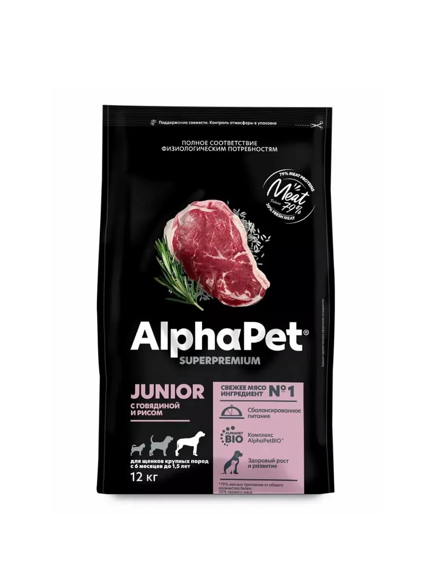 ALPHAPET SUPERPREMIUM 12 кг сухой корм с говядиной и рисом для щенков крупных пород с 6 месяцев до 1,5 лет