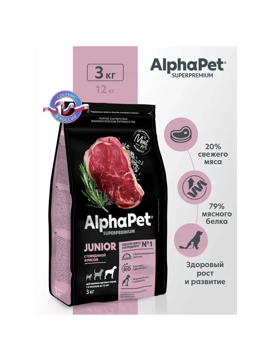 ALPHAPET SUPERPREMIUM 3 кг сухой корм с говядиной и рисом для щенков крупных пород с 6 месяцев до 1,5 лет