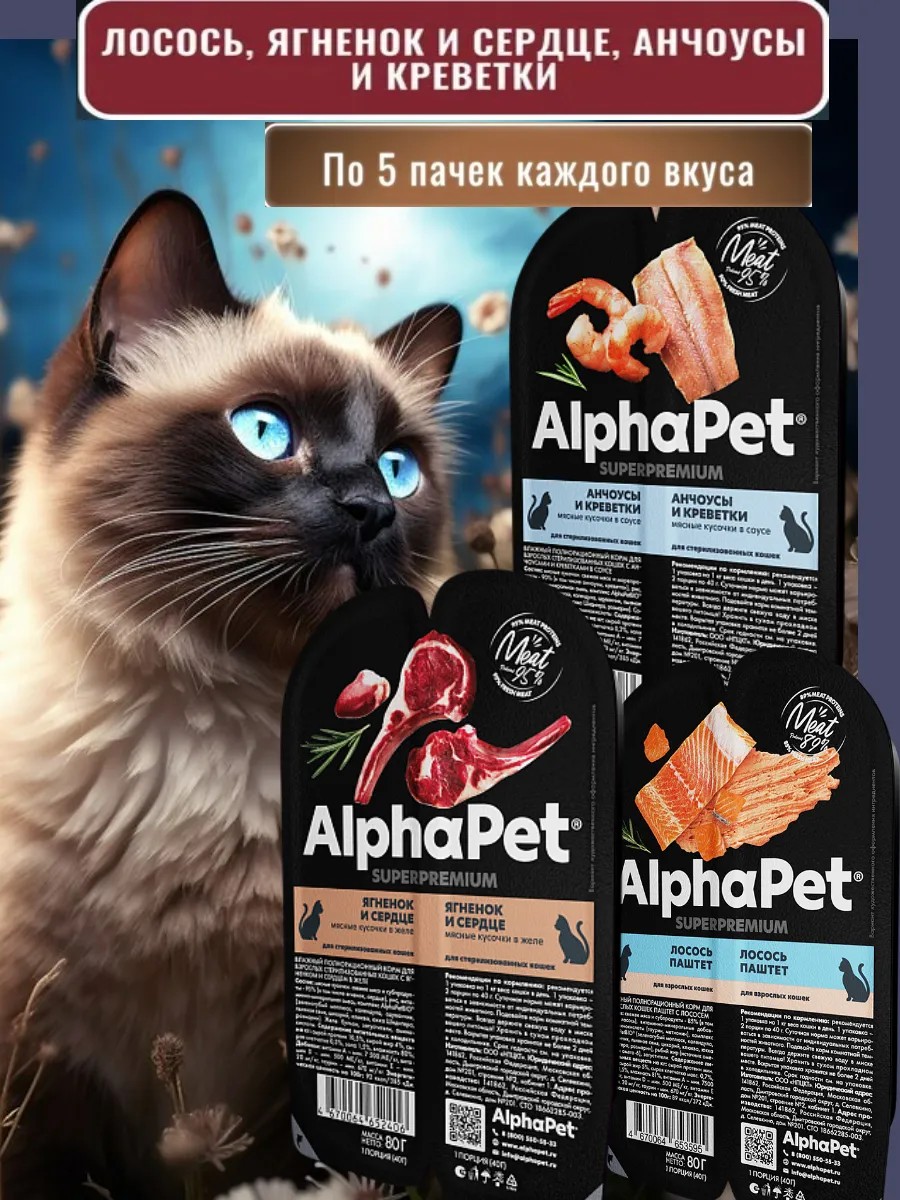 AlphaPet Влажный корм для кошек анчоусы, ягненок и сердце, лосось