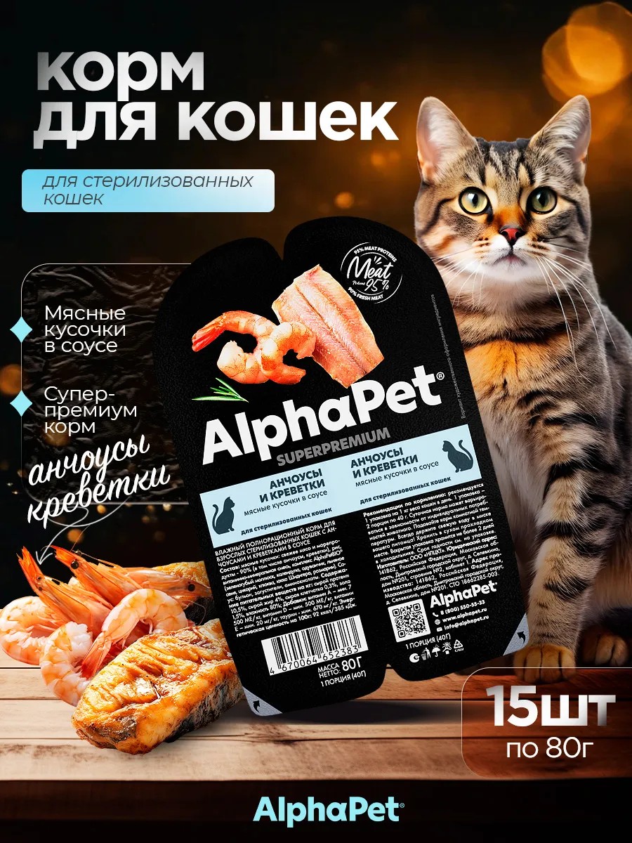 AlphaPet Wet food for cats Sterilized anchovies and shrimp 15*80 g
