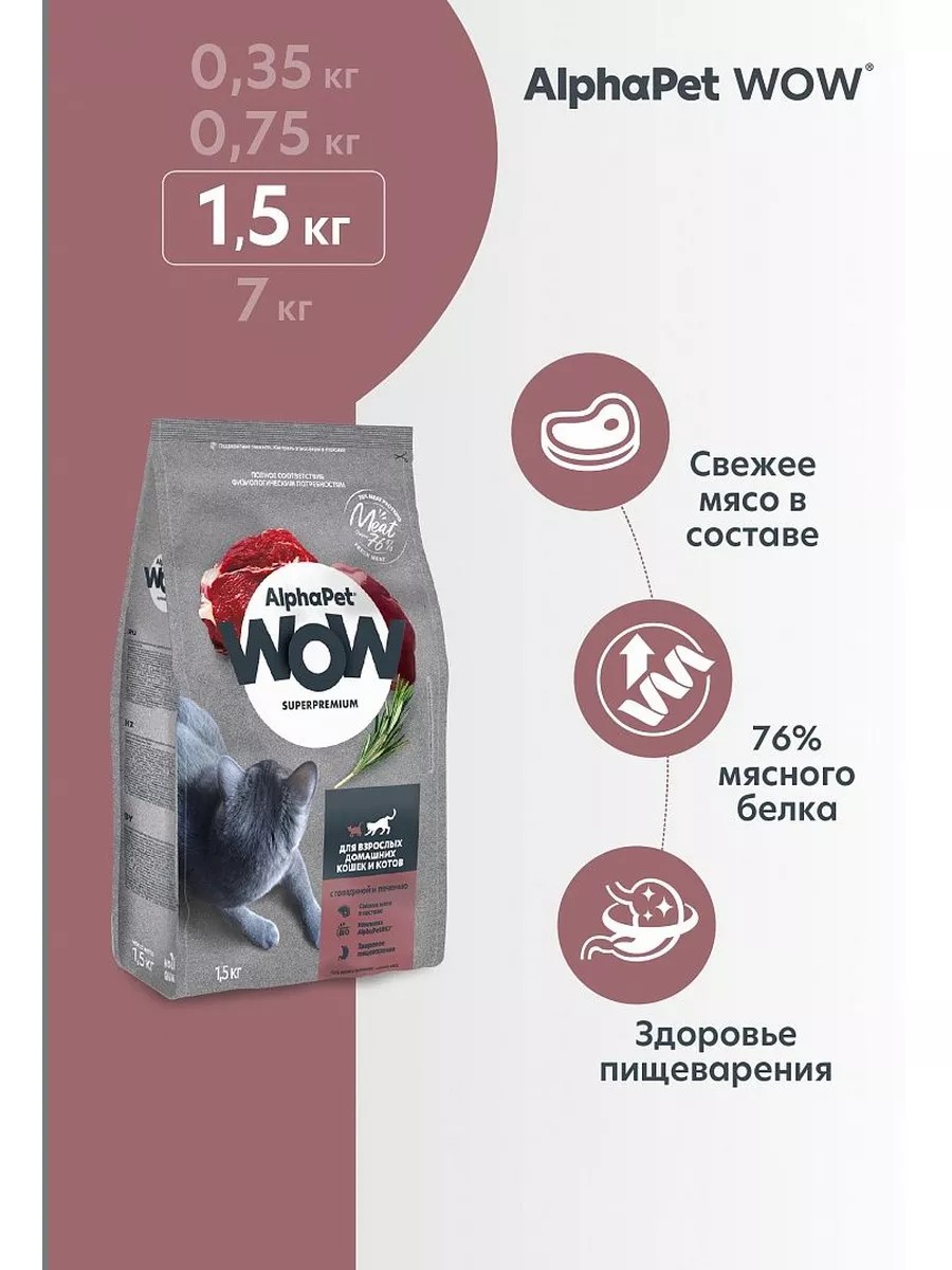 AlphaPet WOW сухой корм для домашних кошек - Говядина и печень 1,5кг
