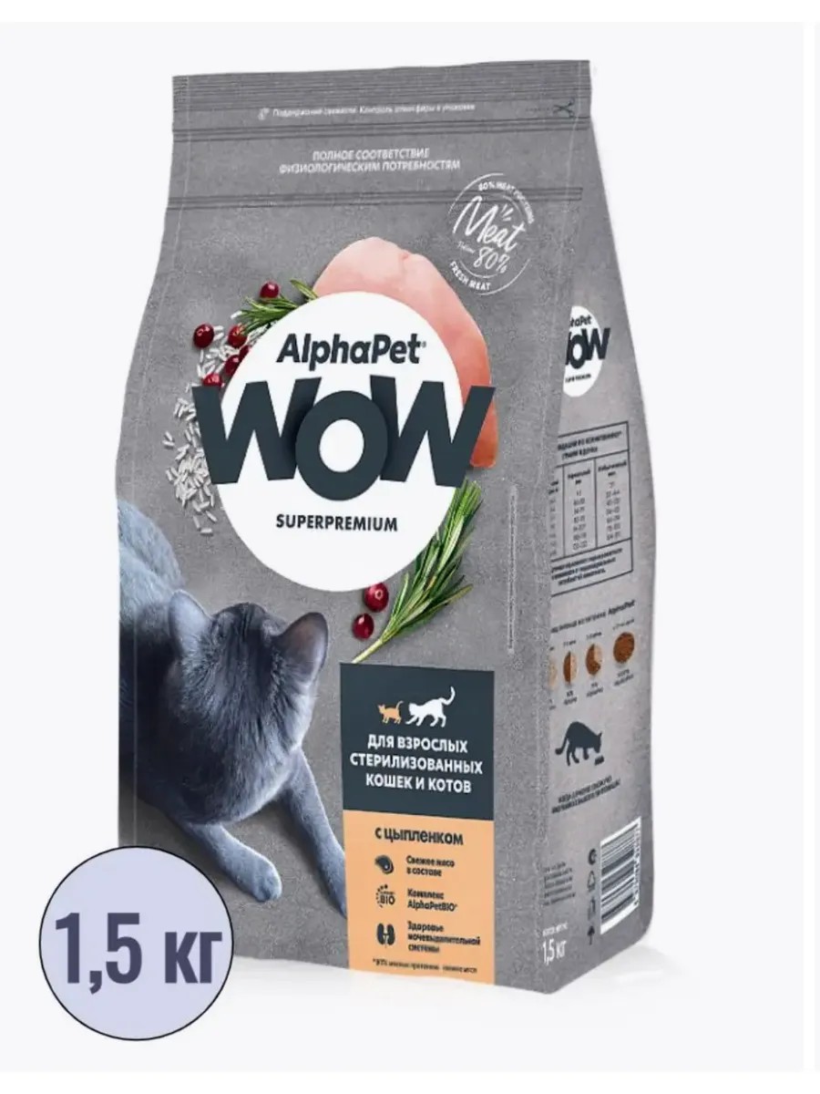 AlphaPet WOW Корм сухой для стерилизованных кошек с цыпленком 1,5 кг