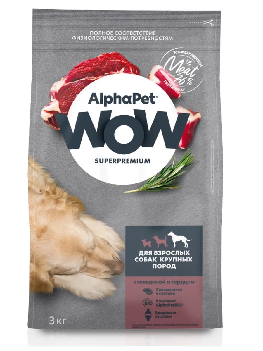 AlphaPet Корм WOW для собак крупных пород с Говядиной и сердцем 3кг