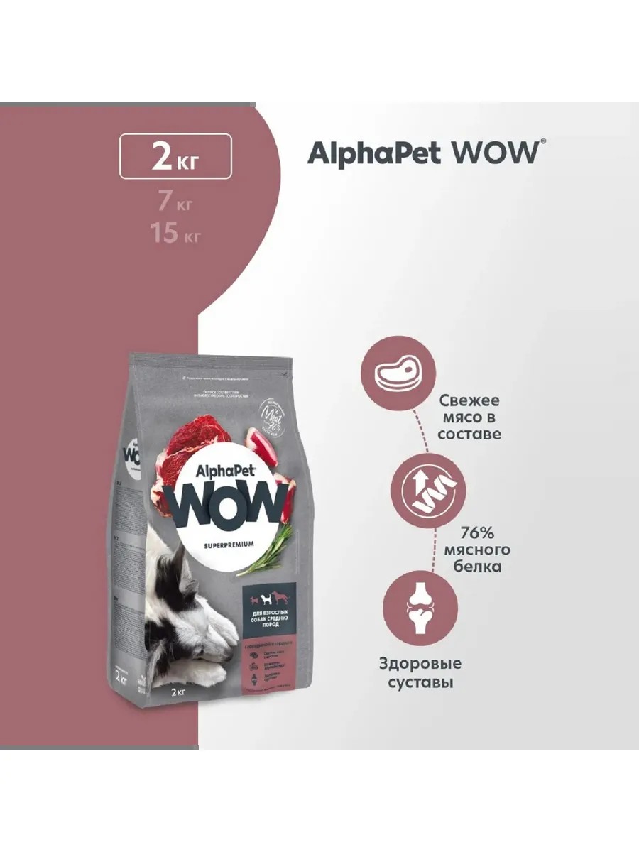 AlphaPet WOW Superpremium / Сухой полнорационный корм с говядиной и сердцем для взрослых собак средних пород