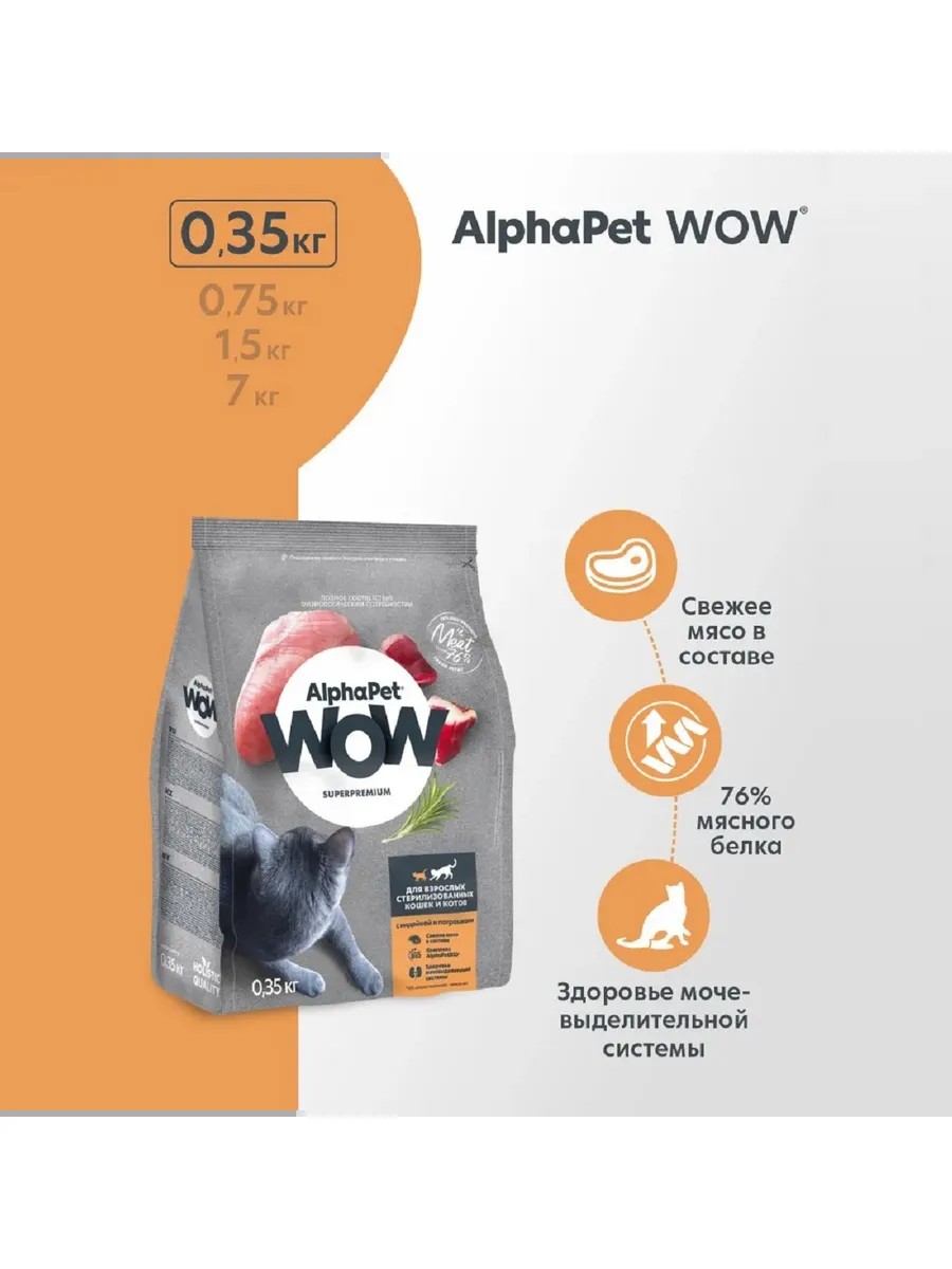 AlphaPet WOW Superpremium / Сухой полнорационный корм с индейкой и потрошками для взрослых стерилизованных кошек и котов