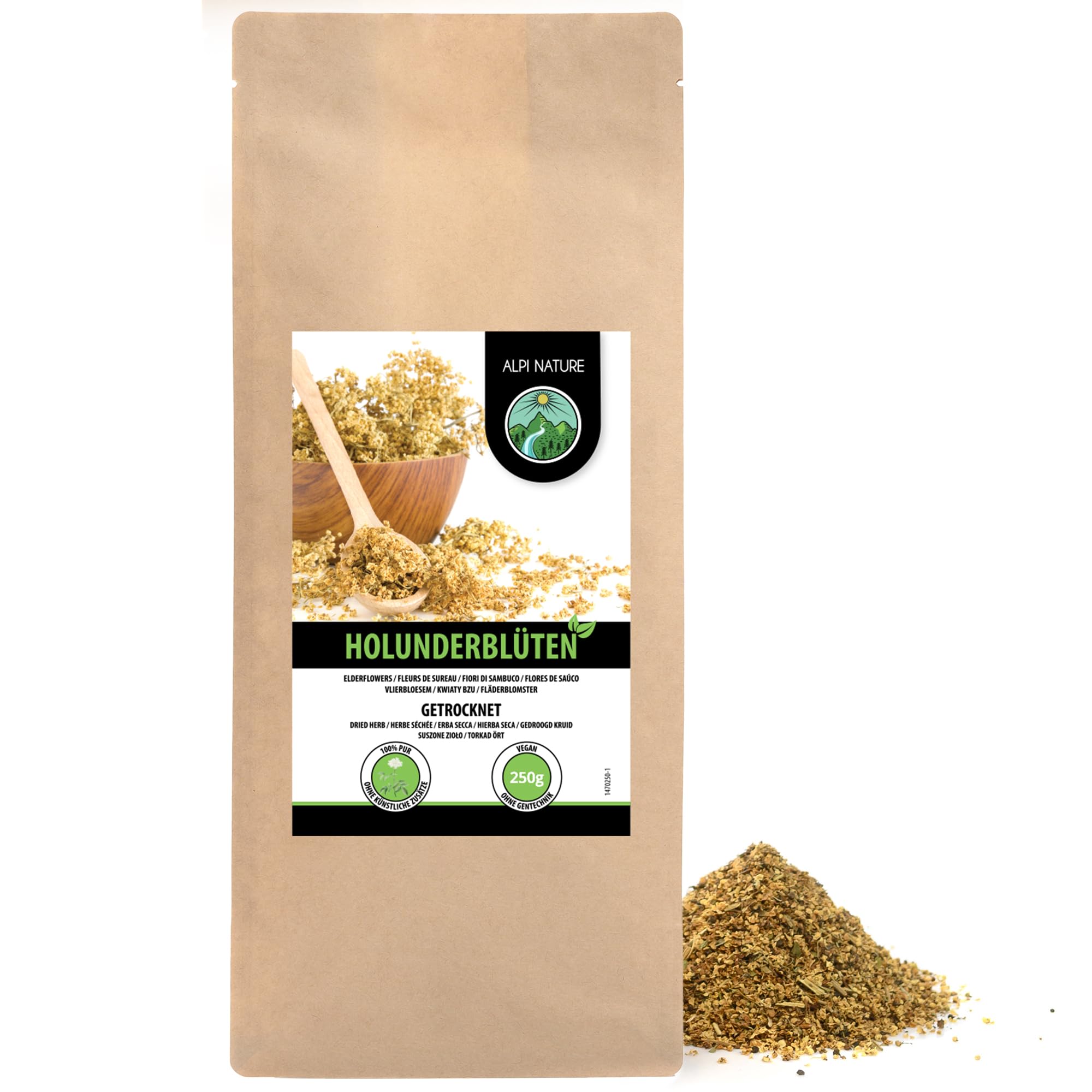 Alpi Nature's elderberry meets the highest quality standards and is: Free from additives, artificial flavors and colors, Vegan, Dried carefully. The elderberry tea comes from controlled cultivation and is filled in a resealable package. INGREDIENTS 100 dried elderflower INSTRUCTIONS FOR USE Pour one to two teaspoons per cup (250 ml) with boiling water and let stand for about 10 to 12 minutes, depending on your taste. MANUFACTURER CONTACT INFORMATION UNIT 104535, PO BOX 6945, LONDON, W1A 6US See moreVlierbloesemthee, ingewreven vlierbloesem, zacht gedroogde vlierbloesemthee, 100 puur en natuurlijk (250 GR) De vlierbes van Alpi Nature voldoet aan de hoogste kwaliteitsnormen en is: Vrij van toevoegingen, kunstmatige smaak- en kleurstoffen, Veganistisch, Voorzichtig gedroogd. De vlierbessenthee is afkomstig van gecontroleerde teelt en wordt afgevuld in een hersluitbare verpakking. INGREDIËNTEN 100 gedroogde vlierbloesem GEBRUIKSAANWIJZING Giet een tot twee theelepels per kop (250 ml) met kokend water en laat ongeveer 10 tot 12 minuten staan, afhankelijk van uw smaak. CONTACTINFORMATIE FABRIKANT UNIT 104535, PO BOX 6945, LONDEN, W1A 6US Meer bekijken