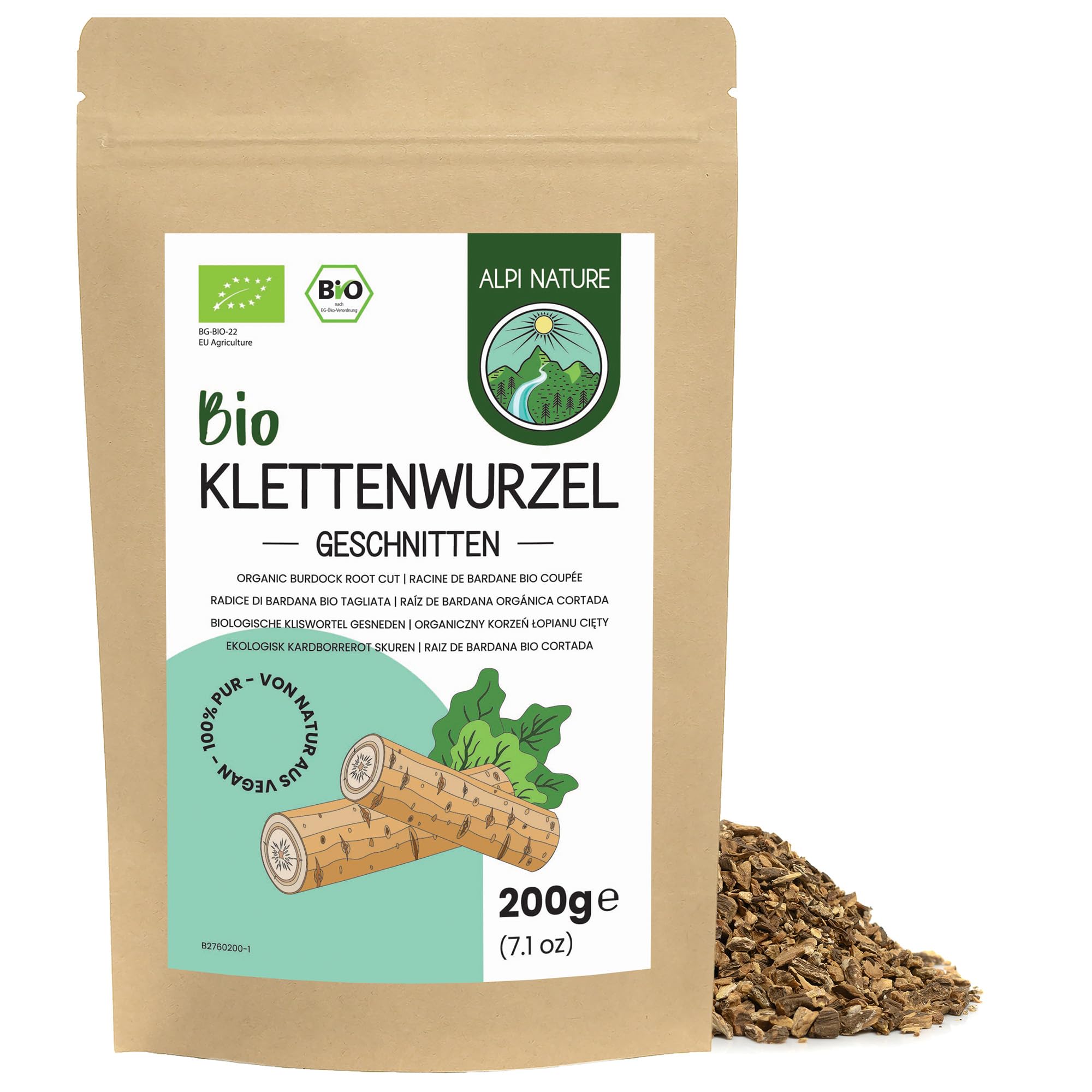 Embrace the earthy warmth of Alpi Nature's Organic Burdock Root Tea. Made from dried and cut pieces of premium burdock root, this herbal infusion delights with its subtly sweet and nutty flavor and enveloping aroma – perfect for daily balance and gentle nourishment. • Earthy and subtly sweet flavor – A smooth, nutty, vegetal taste with subtle sweetness and rich, earthy undertones. Delicious on its own or with honey. • Certified organic – Grown and harvested on EU-certified organic farms, with no additives, preservatives, or artificial flavors. • Rooted in tradition – Carefully selected pieces of burdock root, dried to preserve their full-bodied aroma and natural qualities. • Herbal wellness infusion – An aromatic and enveloping tea for mindful rituals, caffeine-free and naturally sweet. • Easy to brew – Add 1 to 2 teaspoons to 250 ml of hot water, let it steep for 3 to 5 minutes, strain, and enjoy hot. • Eco-friendly packaging – Resealable bag designed to protect aroma, freshness, and quality while aligning with a sustainable lifestyle.Alpi Nature Racine de Bardane BIO Tisane 200g, bio Racine de Bardane Séchée et Coupée, Thé en VracDESCRIPTION DU PRODUIT Adoptez la chaleur terreuse de la tisane de racine de bardane biologique d'Alpi Nature. Fabriquée à partir de morceaux séchés et coupés de racine de bardane de première qualité, cette infusion aux herbes enchante par sa saveur légèrement sucrée et noisetée et son arôme enveloppant – parfaite pour un équilibre quotidien et une alimentation douce. • Saveur terreuse et légèrement sucrée – Un goût végétal onctueux et noiseté avec une douceur subtile et des nuances riches et terreuses. Délicieux seul ou accompagné de miel. • Certifié biologique – Cultivé et récolté dans des fermes biologiques certifiées par l'UE, sans additifs, conservateurs ni arômes artificiels. • Ancré dans la tradition – Morceaux de racine de bardane soigneusement sélectionnés, séchés pour préserver leur arôme corsé et leurs qualités naturelles. • Infusion bien-être aux herbes – Une tisane aromatique et enveloppante pour des rituels de pleine conscience, sans caféine et naturellement douce. • Simple à infuser – Ajouter 1 à 2 cuillères à café à 250 ml d'eau chaude, laisser infuser 3 à 5 minutes, filtrer et déguster chaud. • Emballage écologique – Sachet refermable conçu pour protéger l'arôme, la fraîcheur et la qualité tout en s'alignant sur un mode de vie durable.