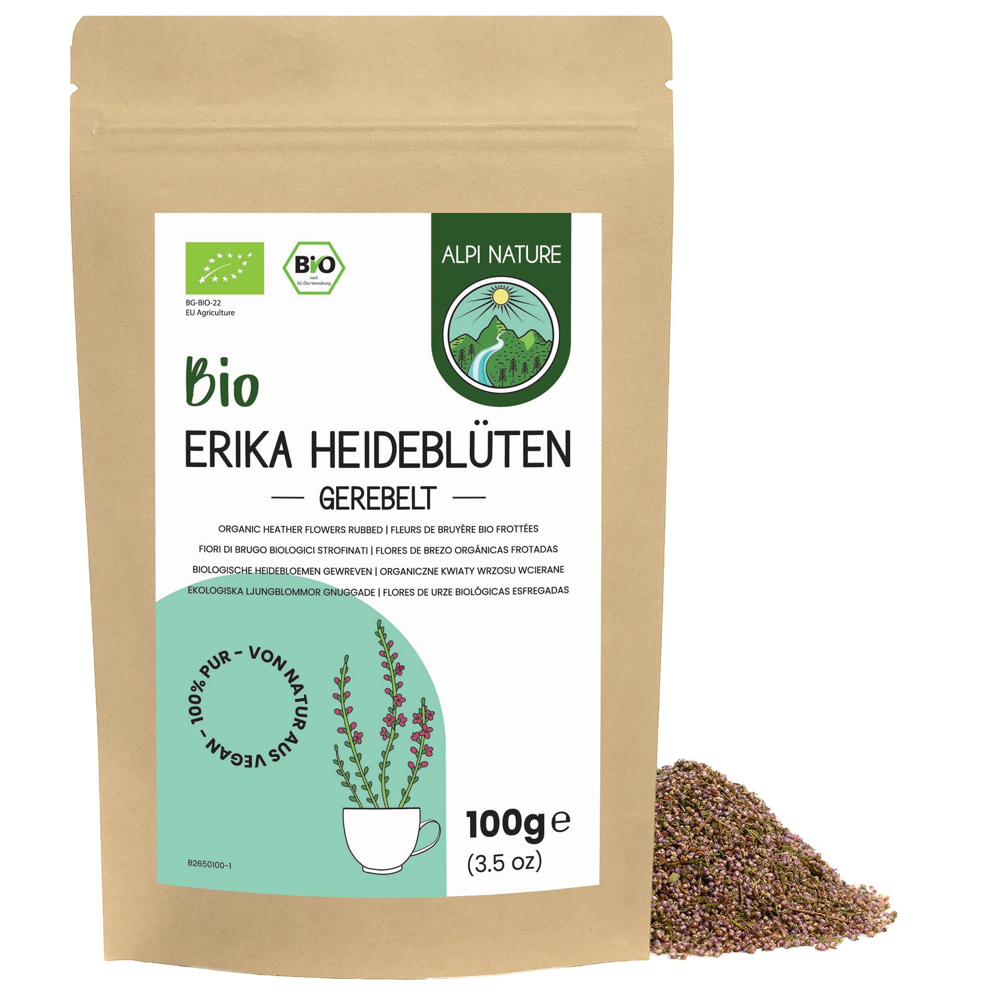 Delicate and aromatic – Alpi Nature Organic Heather Flower Tea. Made from dried and gently rubbed heather flowers, this floral infusion offers a smooth and aromatic tea experience inspired by wild moors. • Elegant floral flavor – Lightly sweet and woody with subtle floral notes, ideal for a peaceful tea time. • Certified organic – Sustainably sourced and processed according to EU organic standards. No additives or preservatives. • Naturally caffeine-free – Enjoy at any time of day, especially for gentle evening relaxation. • Traditionally valued herb – Heather has long been used in herbal teas and infusions for its delicate aroma and gentle presence in nature-inspired rituals. • Easy to prepare – Infuse 1 to 2 teaspoons in 250 ml of hot water for 5 to 7 minutes, then strain. Add honey if desired. • Resealable packaging – Designed to preserve freshness, aroma and quality, while reducing waste.