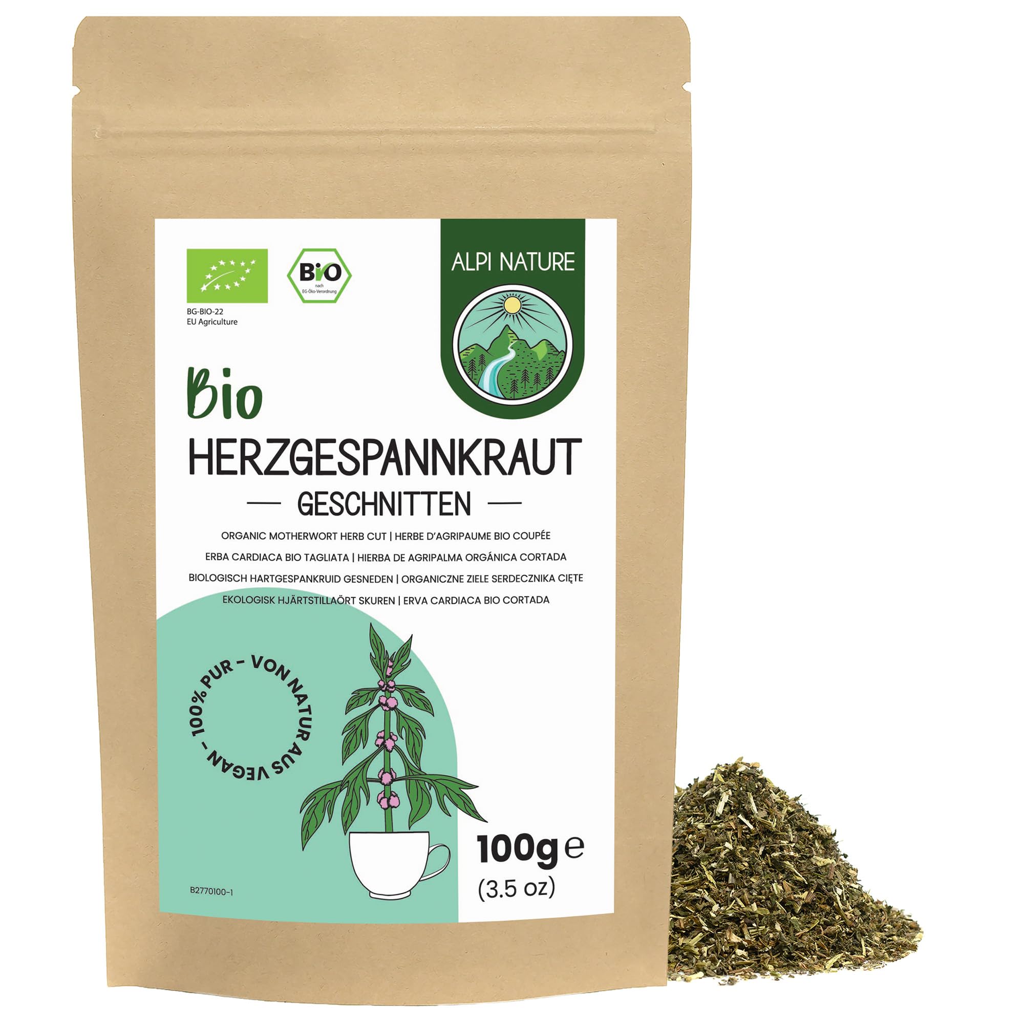 Discover the bold character of Alpi Nature's Organic Motherwort Tea. Made from carefully selected and dried Leonurus cardiaca leaves, this infusion offers a distinctive earthy and bitter flavor, traditionally valued for its grounding and harmonizing qualities. • Bitter and Earthy Flavor – A robust infusion with strong, naturally bitter notes. Best enjoyed with honey or a natural sweetener to soften its intensity. • Certified Organic – Sourced from EU-certified organic farms, with no additives, preservatives, or artificial flavors. • Pure and Vibrant Herb – Dried and cut motherwort leaves, carefully processed to retain the plant's natural essence and beneficial compounds. • Herbal Tradition – A tea enjoyed in herbal wellness routines, ideal for those seeking a bold and unfiltered herbal character. • Easy to brew – Add 1 to 2 teaspoons of loose herb to 250 ml of hot water, let it steep for 3 to 5 minutes, strain, and enjoy. • Sustainable packaging – Resealable bag designed to preserve freshness, flavor, and aroma, while promoting an environmentally conscious lifestyle.Alpi Nature Agripaume Infusion BIO 100g, bio Herbe d'Agripaume Séchée et Coupée, Tisane en VracDESCRIPTION DU PRODUIT Découvrez le caractère audacieux de la tisane d'agripaume biologique d'Alpi Nature. Fabriquée à partir de feuilles de Leonurus cardiaca soigneusement sélectionnées et séchées, cette infusion offre une saveur terreuse et amère distinctive, traditionnellement appréciée pour ses qualités enracinantes et harmonisantes. • Saveur amère et terreuse – Une infusion robuste aux notes fortes et naturellement amères. À déguster de préférence avec du miel ou un édulcorant naturel pour en adoucir l'intensité. • Certifié biologique – Issu de fermes biologiques certifiées par l'UE, sans additifs, conservateurs ni arômes artificiels. • Herbe pure et vibrante – Feuilles d'agripaume séchées et coupées, soigneusement traitées pour conserver l'essence naturelle de la plante et ses composés bénéfiques. • Tradition herbacée – Une tisane appréciée dans les routines de bien-être à base de plantes, idéale pour ceux qui recherchent un caractère herbacé audacieux et non filtré. • Simple à infuser – Ajoutez 1 à 2 cuillères à café d'herbe en vrac à 250 ml d'eau chaude, laissez infuser 3 à 5 minutes, filtrez et savourez. • Emballage durable – Sachet refermable conçu pour préserver la fraîcheur, la saveur et l'arôme, tout en favorisant un mode de vie respectueux de l'environnement.