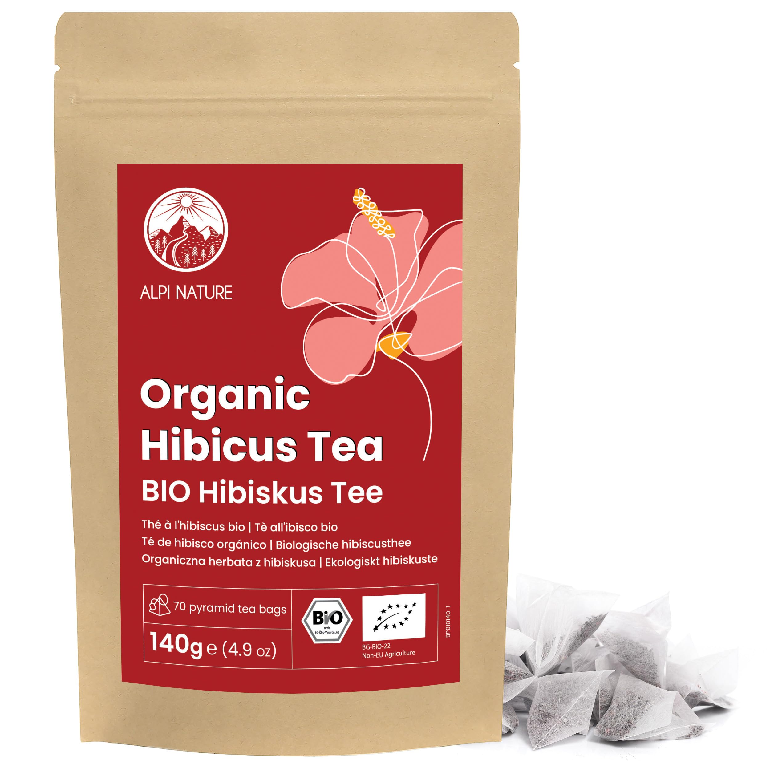 Alpi Nature Thé d'Hibiscus BIO, 70 Sachets de Thé Pyramidaux, 140g (1 Paquet x 70 Sachets de 2g), Fleur Hibiscus Séchée