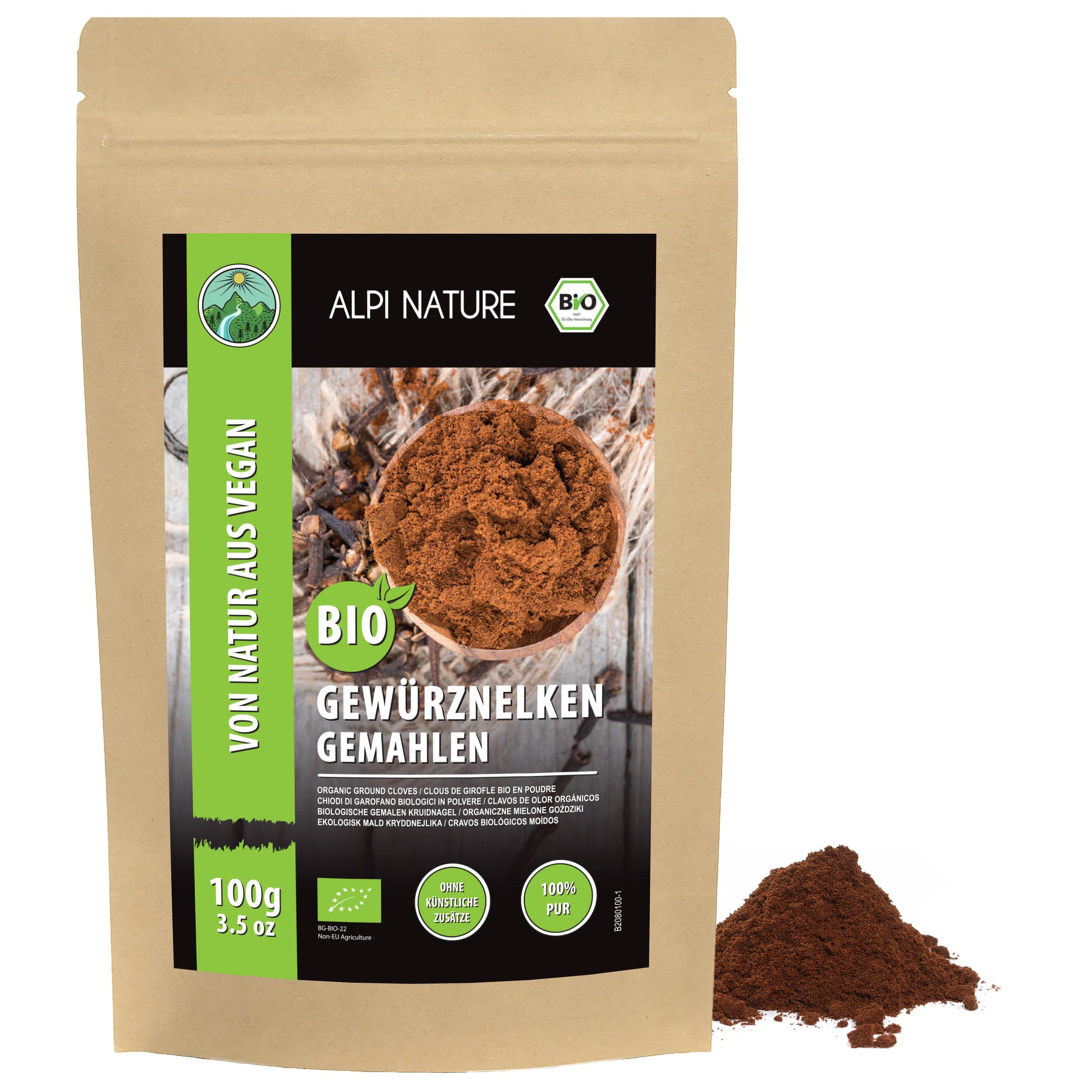 Quality Commitment: We adhere to exceptional standards throughout the entire value chain, from cultivation to packaging, to ensure consistent product quality. Organic Origin: Sourced from certified organic farms, this product meets EU organic standards for quality and purity. Certified by Nutramed (Control Body: BG-BIO-22, Control Number: BG-BIO-22.100-0001488.2025.002). Authentic Taste: Our clove powder, made from delicately dried and ground flower buds, is a single-ingredient product of natural origin. Naturally vegan, it is free of gluten, additives, preservatives, and artificial flavors. Multiple Uses: Clove powder is used in the preparation of cookies, pies, and cakes, as well as in spice blends such as garam masala. It is also added to savory dishes, marinades, sauces, and drinks such as mulled wine, chai, or hot cider. Cloves are the dried flower buds of the clove tree, a tree native to Southeast Asia. They have a strong, aromatic flavor with warm, sweet, and slightly bitter notes, and are often used in both sweet and savory dishes and in spice blends such as garam masala and pumpkin spice.Engagement qualité: Nous respectons des normes exceptionnelles tout au long de la chaîne de valeur, de la culture à l'emballage, afin de assurer une qualité constante des produits. Origine biologique: Issu de cultures biologiques certifiées, ce produit répond aux normes biologiques de l'UE en matière de qualité et de pureté. Certifié par Nutramed (Organe de Contrôle: BG-BIO-22, Numéro de Contrôle: BG-BIO-22.100-0001488.2025.002). Goût authentique: Notre poudre de clou de girofle, élaborée à partir de boutons floraux délicatement séchés et moulus, est un produit mono-ingrédient d'origine naturelle. Naturellement végétalienne, elle est sans gluten, additifs, conservateurs ni arômes. Utilisation multiple: La poudre de clou de girofle est utilisée pour la préparation de biscuits, de tartes et de gâteaux, ainsi que dans des mélanges d'épices comme le garam masala. Elle est également ajoutée aux plats salés, aux marinades, aux sauces et aux boissons comme le vin chaud, le chai ou le cidre chaud. Les clous de girofle sont les boutons floraux séchés du giroflier, un arbre originaire d'Asie du Sud-Est. Ils ont une saveur forte et aromatique avec des notes chaudes, sucrées et légèrement amères, souvent utilisées dans les plats sucrés et salés et dans les mélanges d'épices comme le garam masala et les épices de citrouille.Alpi Nature Clou de Girofle en Poudre BIO 100g, Poudre de Clous de Girofle bio Moulus, Épice de Cuisine 100 GR