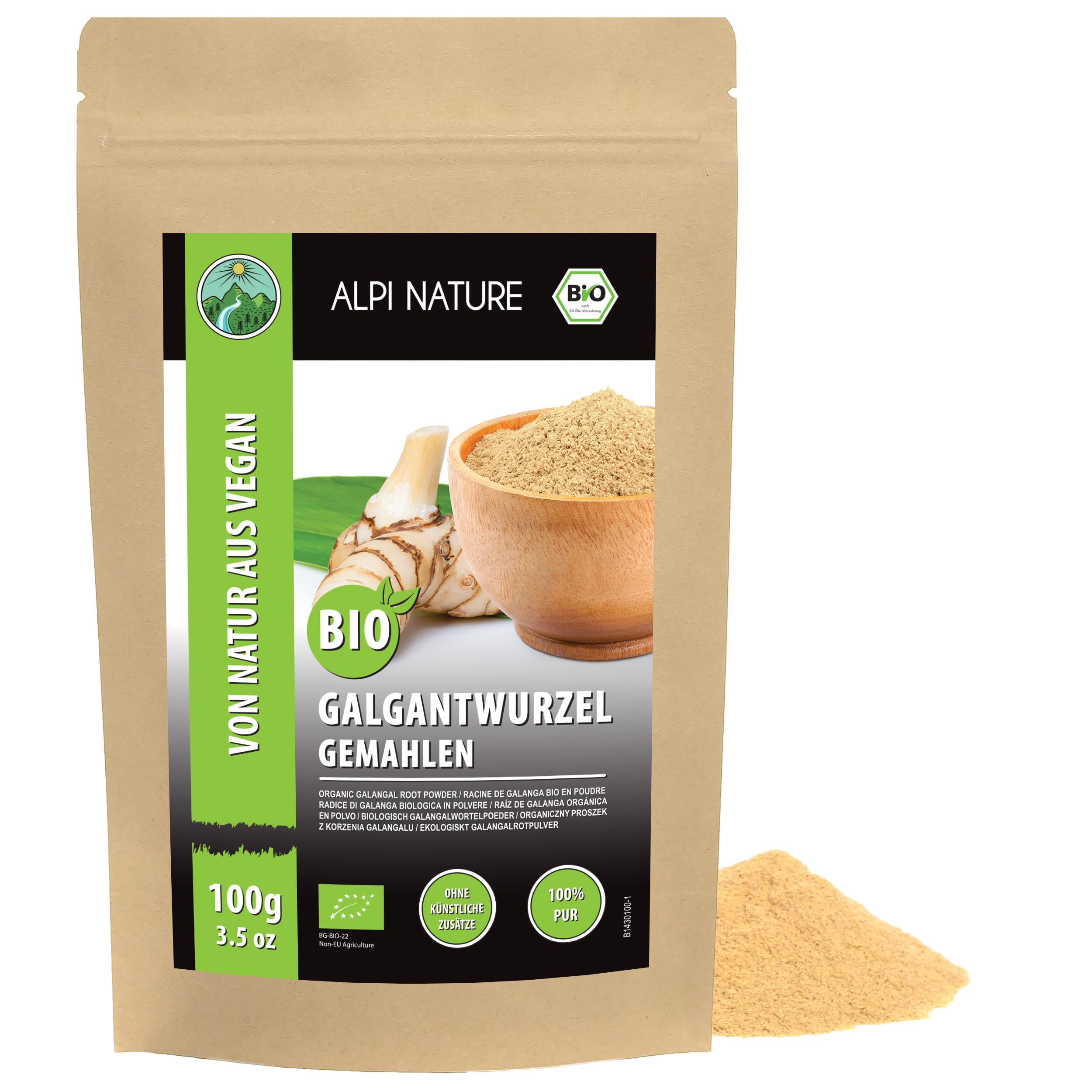 Quality Commitment: We adhere to exceptional standards throughout the entire value chain, from cultivation to packaging, to ensure consistent product quality. Organic Origin: Sourced from certified organic farms, this product meets EU organic standards for quality and purity. Certified by Nutramed (Control Body: BG-BIO-22, Control Number: BG-BIO-22.100-0001488.2025.002). Authentic Taste: Our galangal powder, produced from delicately dried and ground galangal roots, is a single-ingredient product of natural origin. It is naturally vegan and free from gluten, additives, preservatives, or artificial flavors. Multiple Uses: Galangal root powder is used in soups, curries, marinades, stir-fries, teas, and spice blends, adding a pungent, citrusy flavor similar to ginger. Galangal root is a Southeast Asian spice in the ginger family, known for its rough texture and distinctive flavor. Also called Thai ginger, its pungent, lemony, and slightly peppery taste sets it apart from other gingers.Engagement qualité: Nous respectons des normes exceptionnelles tout au long de la chaîne de valeur, de la culture à l'emballage, afin de assurer une qualité constante des produits. Origine biologique: Issu de cultures biologiques certifiées, ce produit répond aux normes biologiques de l'UE en matière de qualité et de pureté. Certifié par Nutramed (Organe de Contrôle: BG-BIO-22, Numéro de Contrôle: BG-BIO-22.100-0001488.2025.002). Goût authentique: Notre poudre de galanga, produite à partir de racines de galanga délicatement séchées et moulues, est un produit à ingrédient unique d'origine naturelle. Il est naturellement végétalien et exempt de gluten, d'additifs, de conservateurs ou d'arômes. Utilisation multiple: La poudre de racine de galanga est utilisée dans les soupes, les currys, les marinades, les sautés, les thés et les mélanges d'épices, ajoutant une saveur piquante et d'agrumes semblable à celle du gingembre. La racine de galanga est une épice d'Asie du Sud-Est de la famille du gingembre, connue pour sa texture rugueuse et sa saveur particulière. Également appelé gingembre thaï, son goût piquant, citronné et légèrement poivré le distingue du gingembre.Alpi Nature Galanga Poudre BIO 100g, Racine de Galanga Moulue pour Assaisonnement 100 GR