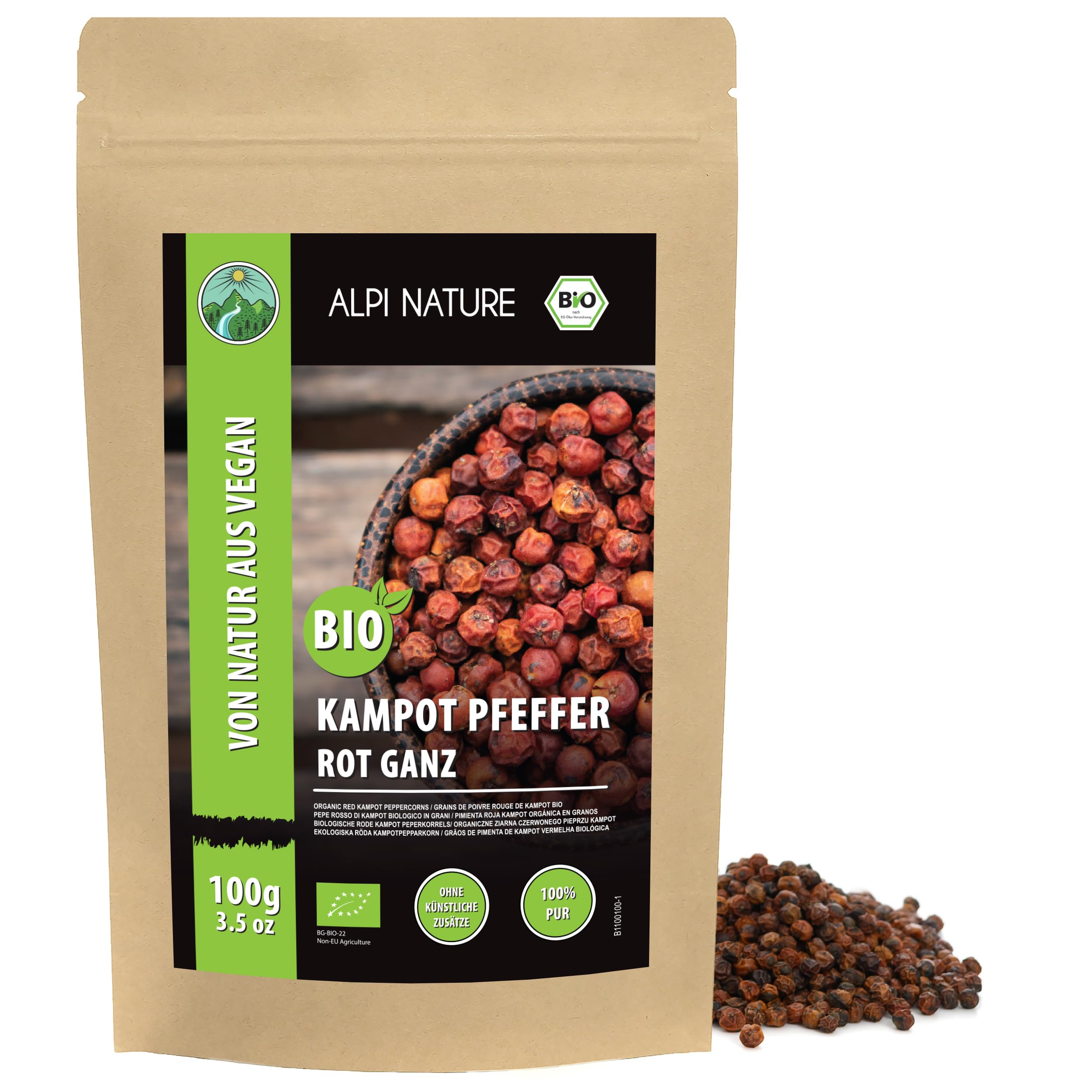 Quality Commitment: We adhere to exceptional standards throughout the entire value chain, from cultivation to packaging, to ensure consistent product quality. Organic Origin: Sourced from certified organic farms, this product meets EU organic standards for quality and purity. Certified by Nutramed (Control Body: BG-BIO-22, Control Number: BG-BIO-22.100-0001488.2025.002). Authentic Taste: Our Kampot peppercorns are gently dried to preserve their natural flavor. They are naturally vegan and free of gluten, additives, preservatives, and artificial flavors. Versatile Use: Kampot red peppercorns are a finishing pepper, adding a unique, fruity, and slightly sweet flavor to gourmet dishes such as seafood, meats, salads, and sauces. Kampot red pepper is a rare and highly prized variety, cultivated in the Kampot region of Cambodia. Made from fully ripe peppercorns, it is renowned for its rich, fruity, subtly sweet flavor and complex floral notes.Engagement qualité: Nous respectons des normes exceptionnelles tout au long de la chaîne de valeur, de la culture à l'emballage, afin de assurer une qualité constante des produits. Origine biologique: Issu de cultures biologiques certifiées, ce produit répond aux normes biologiques de l'UE en matière de qualité et de pureté. Certifié par Nutramed (Organe de Contrôle: BG-BIO-22, Numéro de Contrôle: BG-BIO-22.100-0001488.2025.002). Goût authentique: Nos grains de poivre de Kampot sont délicatement séchés pour préserver leur saveur naturelle. Ils sont naturellement végétaliens et sans gluten, additifs, conservateurs ni arômes. Utilisation multiple: Les grains de poivre rouge de Kampot sont un poivre de finition, ajoutant une saveur unique, fruitée et légèrement sucrée aux plats gastronomiques, tels que les fruits de mer, les viandes, les salades et les sauces. Le poivre rouge de Kampot est une variété rare et très prisée, cultivée dans la région de Kampot, au Cambodge. Issu de grains de poivre bien mûrs, il est réputé pour sa saveur riche et fruitée, subtilement sucrée et ses notes florales complexes.Alpi Nature Poivre Rouge de Kampot BIO 100g, Grains de Poivre bio Rouge de Kampot pour la Cuisine 100 GR