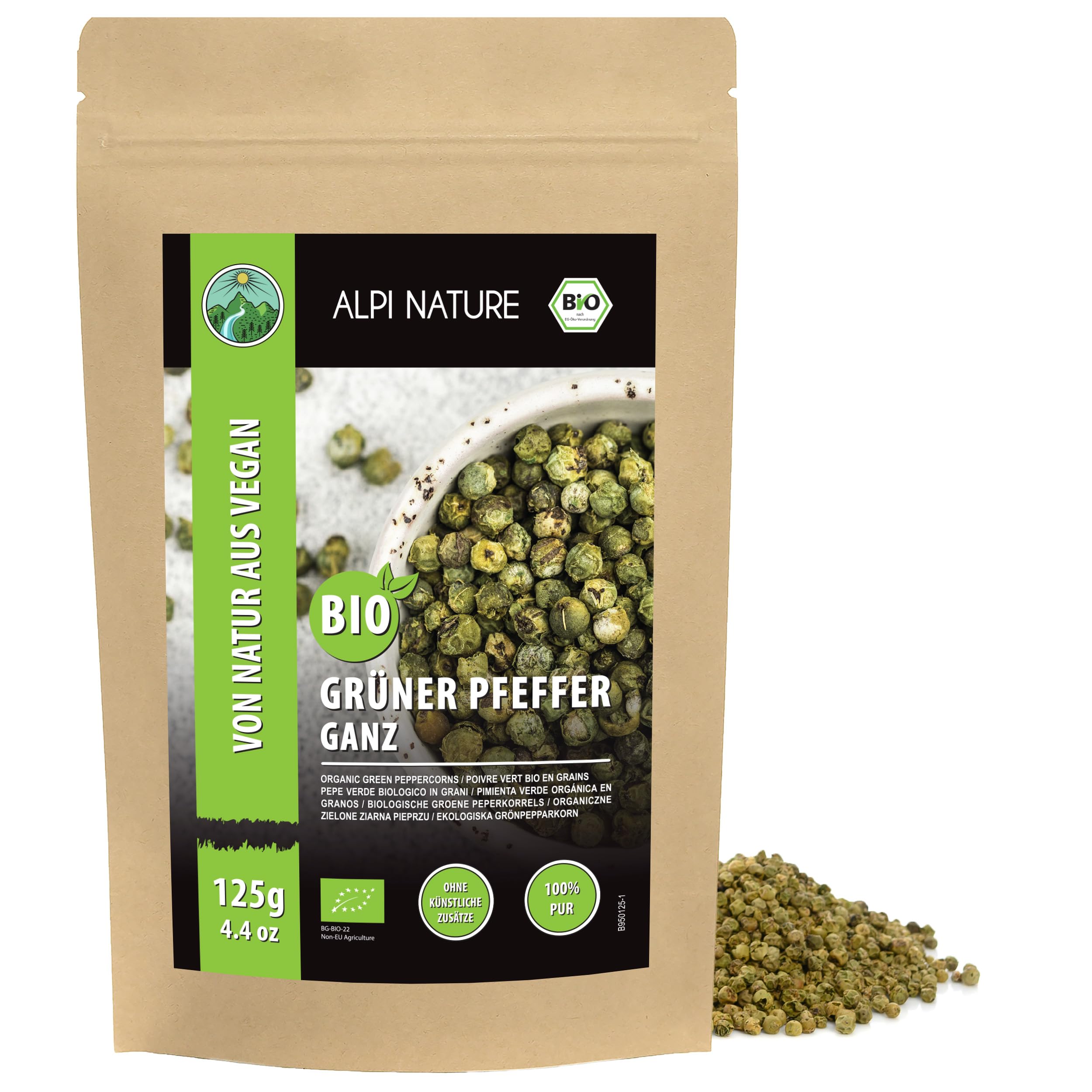 Quality Commitment: We adhere to exceptional standards throughout the entire value chain, from cultivation to packaging, to ensure consistent product quality. Organic Origin: Sourced from certified organic farms, this product meets EU organic standards for quality and purity. Certified by Nutramed (Control Body: BG-BIO-22, Control Number: BG-BIO-22.100-0001488.2025.002). Authentic Taste: Our green peppercorns are gently dried to preserve their natural taste and aroma. They are naturally vegan and free of gluten, additives, preservatives, and artificial flavors. Multiple Uses: Prized for their mild flavor and subtle spiciness, green peppercorns are commonly used in sauces, marinades, stir-fries, and salads, as well as in pickling and preserving recipes. Green peppercorns are immature pepper berries, harvested from the same vine as black and white peppercorns. They have a milder and fresher flavor than their ripe counterparts.Engagement qualité: Nous respectons des normes exceptionnelles tout au long de la chaîne de valeur, de la culture à l'emballage, afin de assurer une qualité constante des produits. Origine biologique: Issu de cultures biologiques certifiées, ce produit répond aux normes biologiques de l'UE en matière de qualité et de pureté. Certifié par Nutramed (Organe de Contrôle: BG-BIO-22, Numéro de Contrôle: BG-BIO-22.100-0001488.2025.002). Goût authentique: Nos grains de poivre vert sont séchés délicatement pour préserver leur goût et leur arôme naturels. Ils sont naturellement végétaliens et sans gluten, additifs, conservateurs ni arômes. Utilisation multiple: Les grains de poivre vert, appréciés pour leur saveur douce et leur piquant subtil, sont couramment utilisés dans les sauces, les marinades, les sautés et les salades, ainsi que dans les recettes de marinage et de conservation. Les grains de poivre vert sont des baies de poivre immatures, récoltées sur la même vigne que les grains de poivre noir et blanc. Ils ont une saveur plus douce et plus fraîche que leurs homologues mûrs.Alpi Nature Poivre Vert en Grain BIO 125g, Poivre Vert Grains Entiers pour la Cuisine et Mélanges d'Épices 125 GR