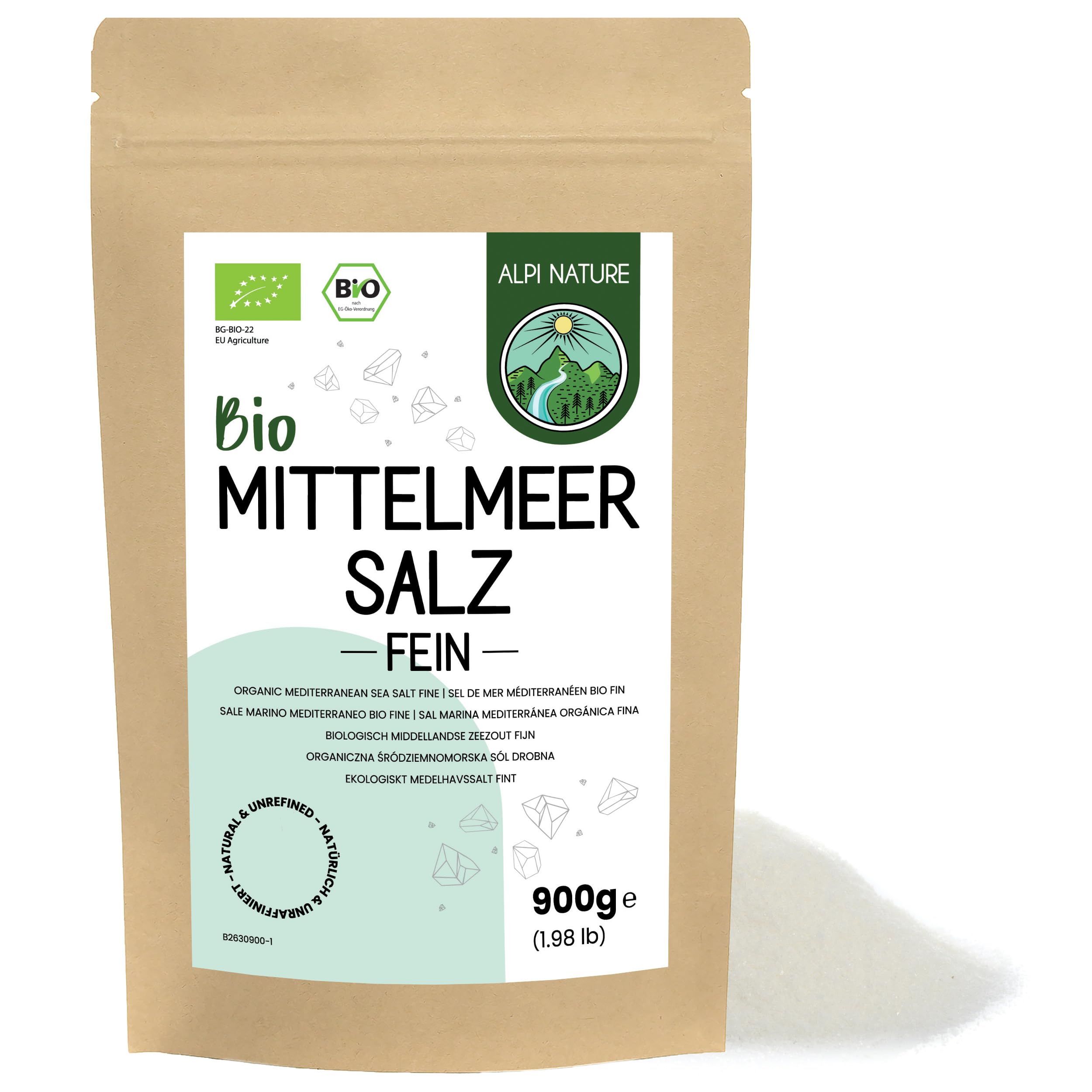 Alpi Nature Sel de Mer Fin Méditerranéen BIO 900g, Sel de Mer Fin Méditerranéen pour la Cuisine 900 g (Lot de 1)