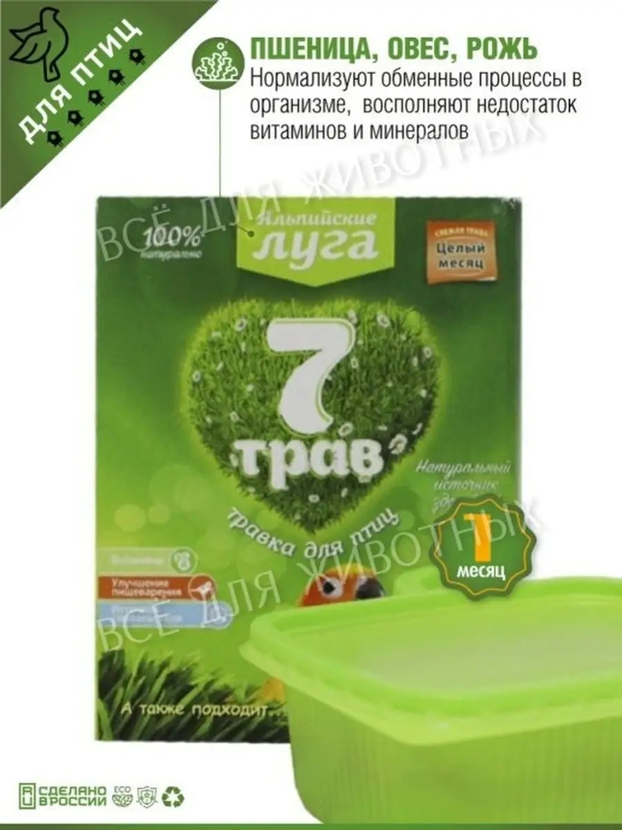Травка для проращивания для птиц "Альпийские Луга" содержит специально подобранные травы из 7 видов растений и обязательно придется по вкусу любому питомцу; быстро всходит и дает свежие побеги в течение месяца, обеспечивая домашнего любимца свежей травой длительное время; сочетание семи видов трав позволяет обеспечить организм наиболее широким перечнем витаминов и микроэлементов, что является залогом здоровья животного. Является естественным источником клетчатки, углеводов, витаминов группы В, витаминов Е, Н, РР, минералов, незаменимых жирных кислот, каротина. Удовлетворяет потребность поедания травы птицами с пользой для здоровья и без вреда для домашних растений. Нормализует обменные процессы в организме птиц, в том числе пищеварительные. Лакомство подходит всем животным: кошкам и собакам, хорькам, птицам и грызунам.