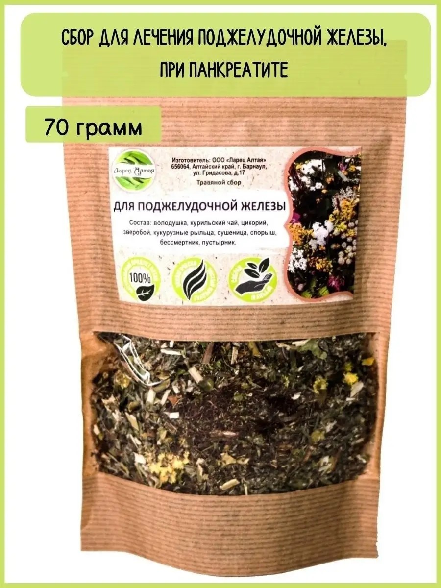 This herbal infusion helps restore pancreatic function and lower blood sugar. It relieves inflammation and normalizes pancreatic function, dissolving compactions. The herbs in this infusion help the pancreas produce enzymes that break down food (insulin, pancreatin). The infusion has anti-inflammatory, bacteriostatic, analgesic, and soothing properties, and stimulates tissue regeneration. Preparation: Pour 250 ml of water at 90-95°C over 1 teaspoon of the infusion and cover with a lid. Let it steep (in a thermos) for 10-20 minutes. Drink like tea. The prophylactic course of treatment is 1 month, and the therapeutic course is 2 months. One package of the infusion lasts for approximately 14 days. **Herbs from the Altaya Casket company are collected in ecologically clean areas of the Altai Mountains, primarily in the foothills. All products are certified.**