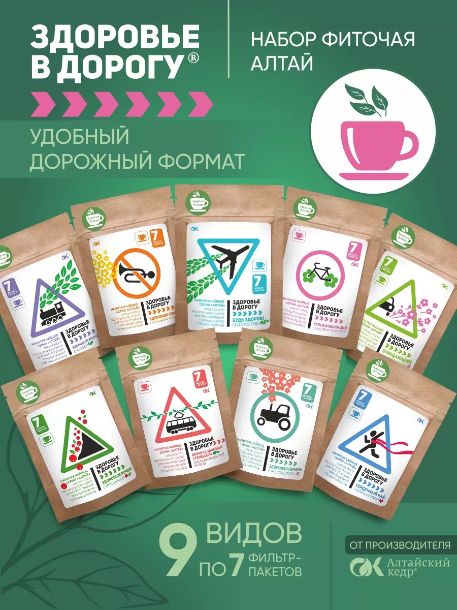 Набор травяного чая Здоровье в дорогу - это 9 самых популярных чайных напитков из трав. Удобная компактная упаковка позволит иметь нужный чай всегда под рукой. Слаженная работа организма и ваше спокойствие будут под защитой и дома, и на работе, и в путешествии. У каждого напитка свой знак, свой символ и свое назначение для хорошего самочувствия. После чашки такого чая любой путь станет легче и комфортнее. Все дороги открыты!