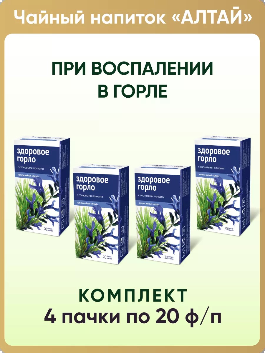 Напиток чайный Здоровое горло - это 100% натуральный травяной чай, собранный из трав Алтая и созданный для вашего здоровья. Травяной сбор эффективен при простуде, при заболеваниях дыхательных путей, при кашле и насморке, при болях в горле. Лечебные травы в составе чая оказывают отхаркивающее и противомикробное действие, облегчают течение вирусных и простудных заболеваний. Почки сосны и корень солодки смягчают кашель и боль в горле, выводят мокроту и облегчают дыхание. Эфирное масло шалфея способствует снятию воспаления и отеков. Мята и чабрец придают чаю приятный травяной вкус и аромат. Полезный травяной чай стимулирует защитные силы организма, укрепляет иммунитет и способствует быстрому восстановлению организма после болезни. Более того, травяной чай улучшает общее самочувствие, эффективен при переутомлении и нервном напряжении.