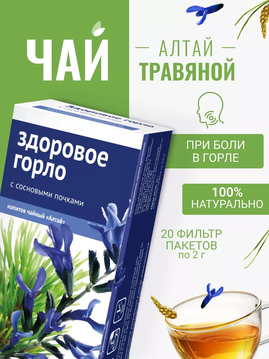 Напиток чайный Здоровое горло - это 100% натуральный травяной чай, собранный из трав Алтая и созданный для вашего здоровья. Травяной сбор эффективен при простуде, при заболеваниях дыхательных путей, при кашле и насморке, при болях в горле. Лечебные травы в составе чая оказывают отхаркивающее и противомикробное действие, облегчают течение вирусных и простудных заболеваний. Почки сосны и корень солодки смягчают кашель и боль в горле, выводят мокроту и облегчают дыхание. Эфирное масло шалфея способствует снятию воспаления и отеков. Мята и чабрец придают чаю приятный травяной вкус и аромат. Полезный травяной чай стимулирует защитные силы организма, укрепляет иммунитет и способствует быстрому восстановлению организма после болезни. Более того, травяной чай улучшает общее самочувствие, эффективен при переутомлении и нервном напряжении.