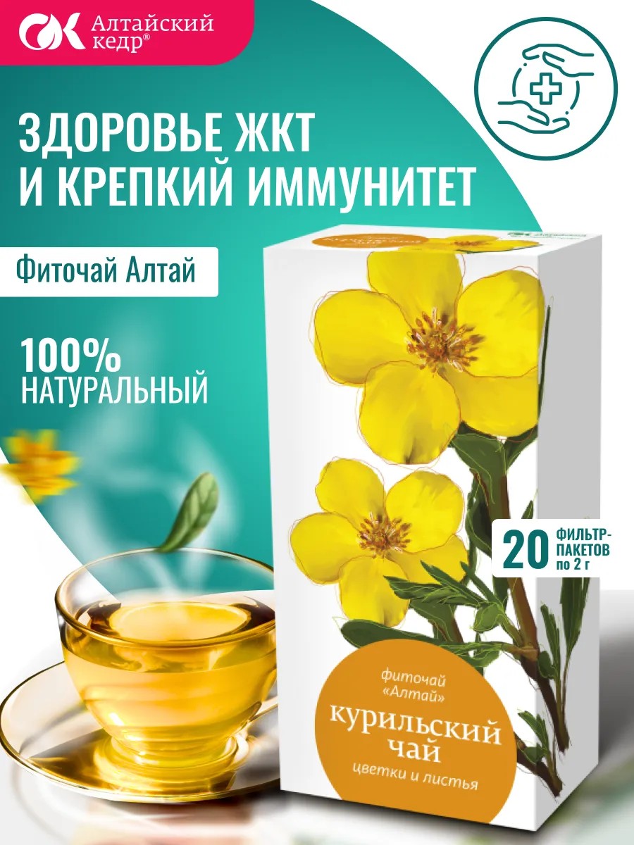 Фиточай Алтай Курильский чай, цветки и листья - натуральный травяной чай, применяется для профилактики и комплексного лечения дисбактериоза, пищевого отравления, как противовоспалительное, успокоительное средство при желудочно-кишечных проблемах. Обладает высокими антимикробными свойствами. Способствует нормализации обмена веществ, благоприятно действует при цистите, дуодените, а также как седативное средство при стрессовых ситуациях. Имеет прекрасный вкус, напоминающий высококачественный китайский зеленый чай.