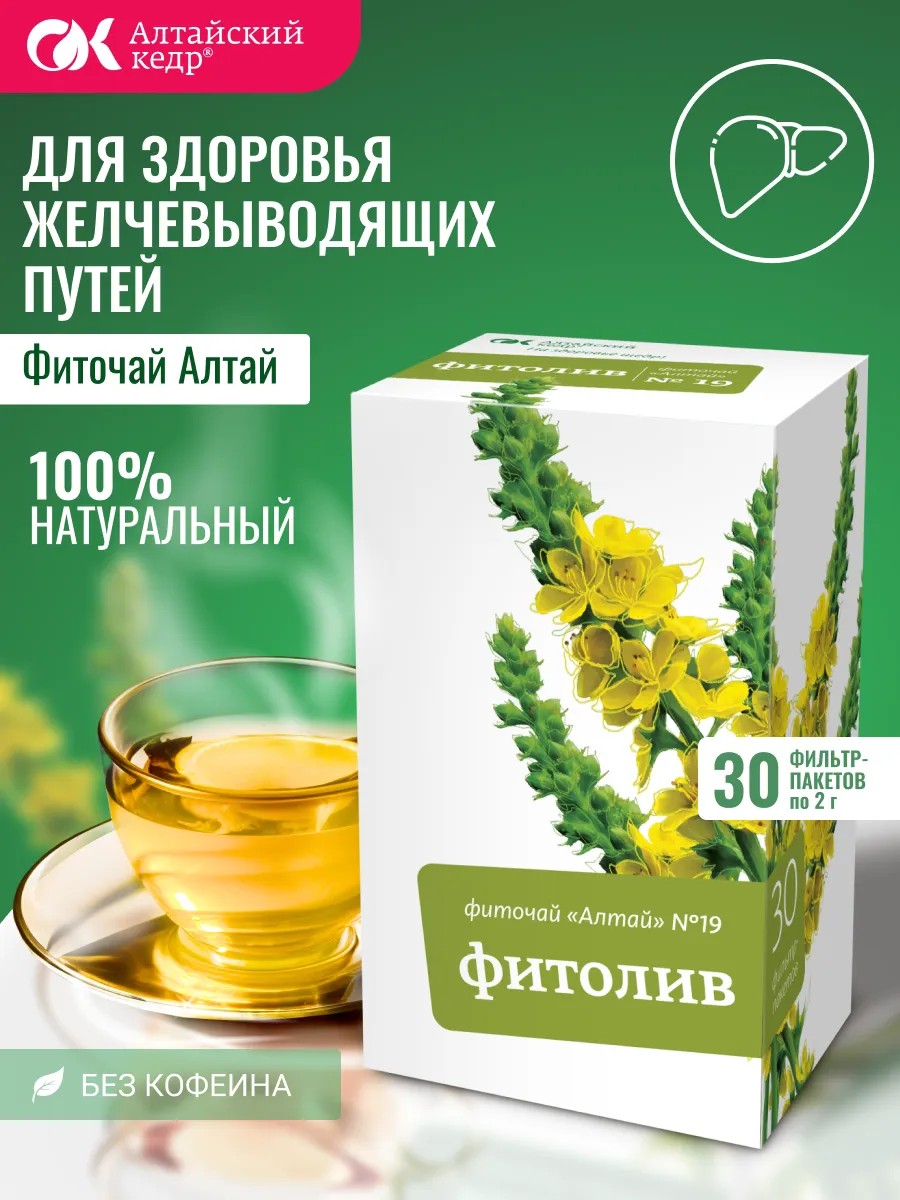 Фиточай Алтай № 19 Фитолив - натуральный травяной сбор, созданный с пользой для здоровья организма, применяется с целью профилактики и при комплексном лечении проблем печени, желчевыводящих путей и желчного пузыря. Лекарственные травы, входящие в состав печеночного чая, способствуют оптимизации выделения желчи, нормализации моторной функции желчевыводящих путей, предупреждению развития застоя желчи и образования камней, усилению функциональной активности кишечника, почек, печени. Расторопша применяется при гепатите, циррозе, желчно-каменной болезни, при различных отравлениях, очищает организм от шлаков, оздоравливает клетки печени, улучшает обмен веществ в организме. Календула применяется как противовоспалительное, дезинфицирующее, антисептическое, желчегонное средство при проблемах печени и желчных путей. Репешок и столбики кукурузы используются как желчегонное и гепатопротекторное средство для лечения хронических заболеваний печени.
