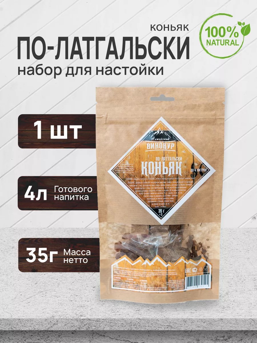 Коньяк по-латгальски -набор позволит приготовить популярную алкогольную вкус которой напоминает элитный коньяк, выдержанный годами. Особенное отличие напитка это получение такого же вкуса за короткое время (2 недели), как и у коньяка при длительном настаивании.Интересный факт:Латгалия это историческая область на востоке Латвии, которая славится самогоноварением. Именно местные винокуры придумали рецепт настойки, которая максимально точно повторяет вкус, цвет, запах настоящих выдержанных годами коньяков.Состав: Гвоздика, кора дуба, кардамон, дубовые кубики, мускатный орех молотый, ванилин, изюм.Рецепт:Дубовые кубики из отдельного пакетика залить горячей водой в отдельной емкости на 1 час. Остывшую воду слить.Вновь залить дубовые сегменты горячей водой ещё на 2 часа. Все ингредиенты, в том числе подготовленные дубовые кубики, высыпать в банку и залить 3л качественного самогона крепостью 45%.Сварите сироп из расчёта 75 г. сахара (3 ст. л.) на 150 мл воды и добавить в настойку. Хорошо перемешать и плотно закрыть банку. Настаивать в тёмном, тёплом месте не менее 14 дней, но не более 1 месяца.Настойка должна приобрести яркий аромат и янтарный, коньячный оттенок. После, отфильтровать настойку через несколько слоев марли или ватный фильтр.Разлить настойку по бутылкам и плотно укупорить. Дать отдохнуть продукту не менее 1 месяца в тёмном месте.