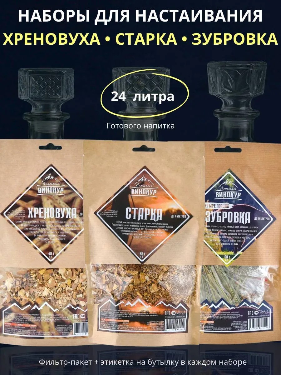 Набор популярных настоек на самогоне или водке. В набора входит 3 вида настоек: Хреновуха, Старка и Зубровка.