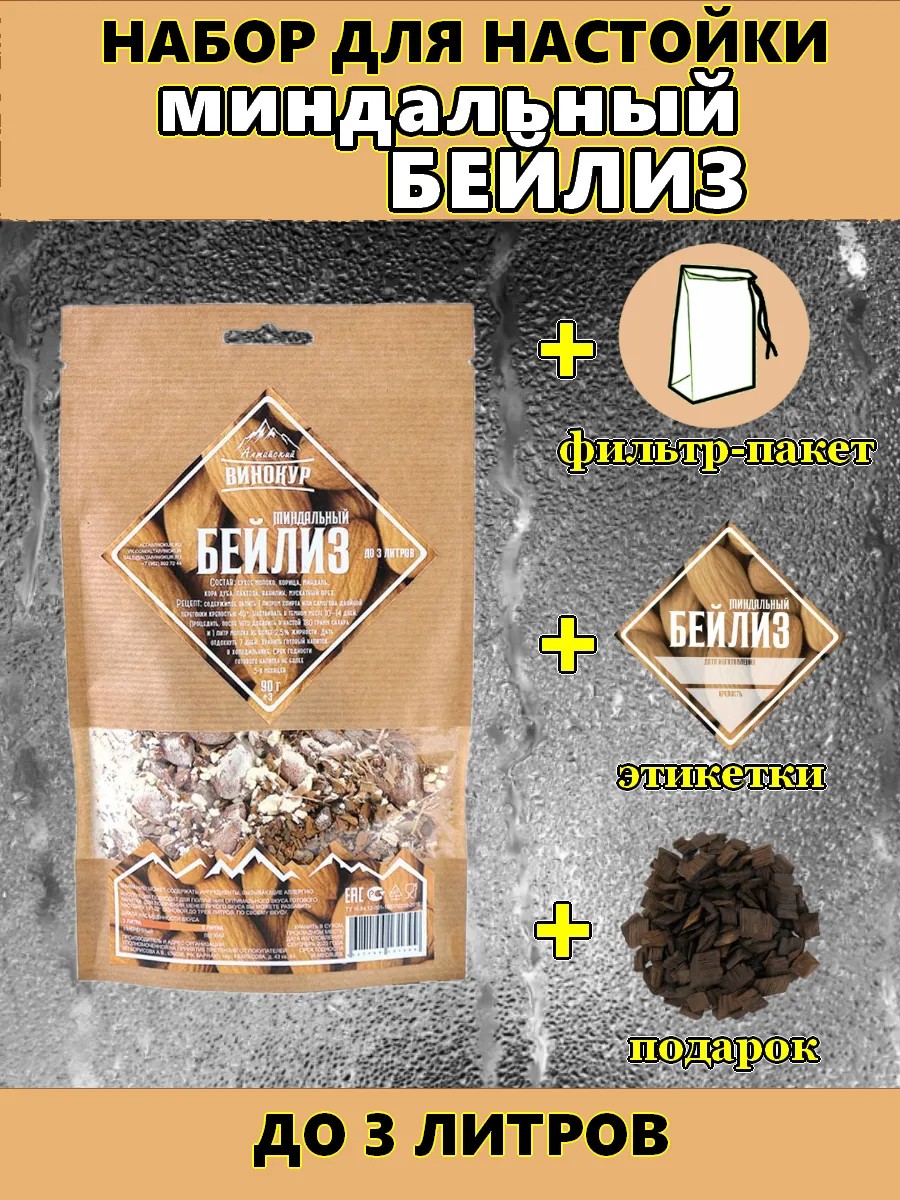 The "Almond Baileys" tincture set "Altai Vinokur" is a great gift for lovers of homemade drinks. The set includes everything you need to prepare a fragrant and delicious tincture: a mix of herbs and spices, a filter bag for easy infusion and filtering, 3 bottle stickers, and oak chips as a gift. A tincture prepared according to this recipe will be a wonderful addition to the holiday table or just a pleasant surprise for a loved one.
