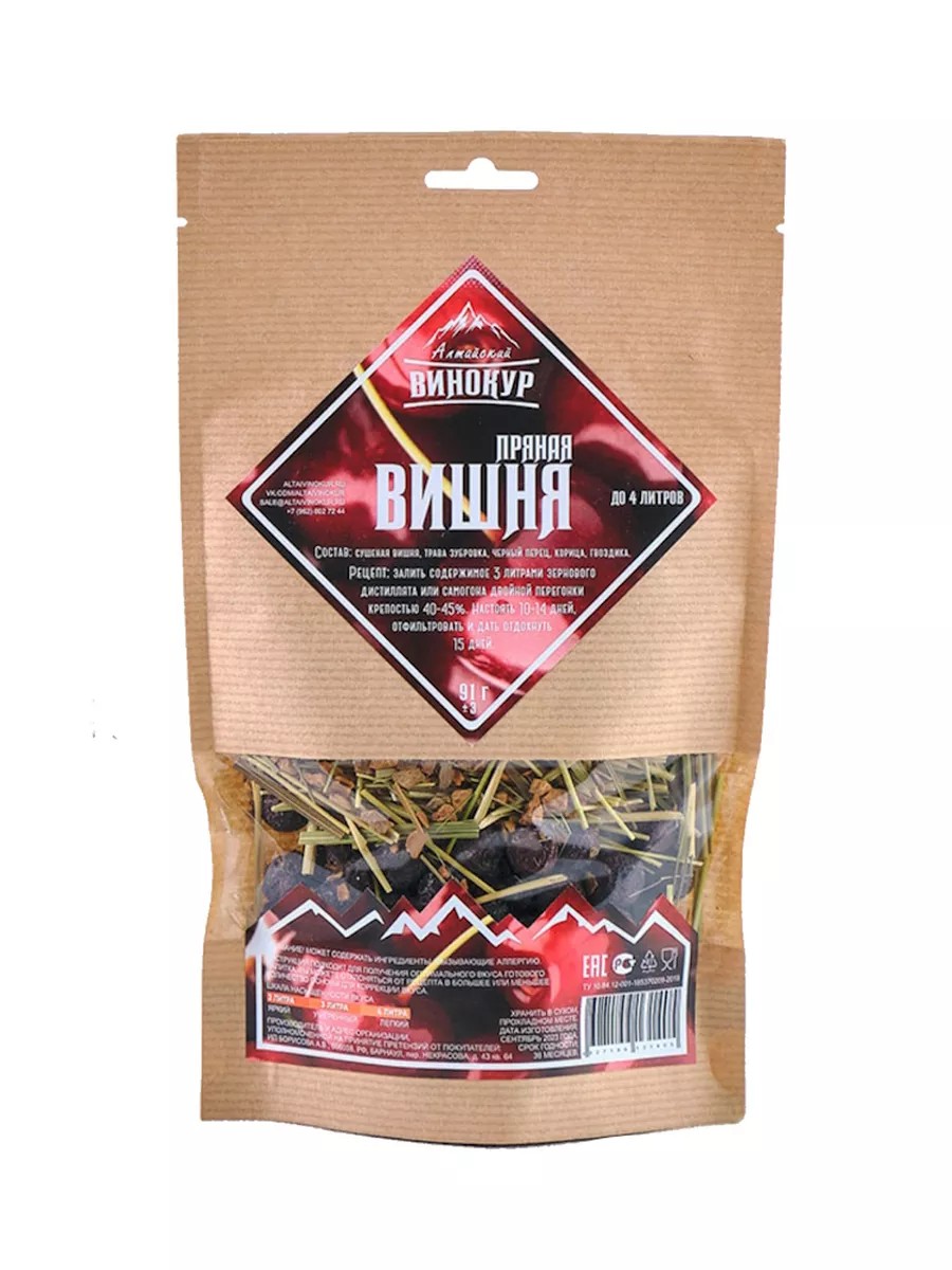 Spiced Cherry. Spiced Cherry tincture for 4 liters of moonshine and vodka. A set of herbs and spices for infusion from the Altai Distiller. A fragrant tincture with a sweet cherry flavor and hints of spice. ~40% vol. : Spiced Cherry from the Altai Distiller is a unique tincture that combines the sweetness of cherries, the freshness of green apple, and spicy notes. This drink embodies sophistication and individuality, bringing brightness and harmony to every sip. The deep amber color of the tincture and the rich fruity aroma with a spicy-sweet undertone create an attractive appearance and make Spiced Cherry from the Altai Distiller irresistible to gourmets and connoisseurs of high-quality tinctures. Its rich and intense flavor, balanced with the slight sourness of cherry, combined with delicate spicy notes, turns every sip into an unforgettable journey through flavors. Ingredients: dried cherries, bison grass, black pepper, cinnamon, cloves. Taste: bright, balanced, fruity taste, turning into cherry notes. Aroma: the fresh aroma reveals notes of cherry, followed by spicy undertones. Color: deep amber-reddish. Recipe: pour contents with 3 liters of grain distillate or double-distilled moonshine with a strength of 40-45%. Infuse for 10-14 days, filter and let rest for 15 days. *3 liters is obtained according to the recipe on the package; if the drink seems cloying, you can dilute it to 4 liters with a base of a similar strength.