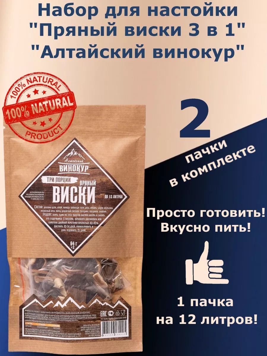Spiced Whiskey 3-in-1. "Spiced Whiskey 3-in-1" tincture for 9 liters (3 servings, each 3 liters) for moonshine and vodka. A set of herbs and spices for infusion from the company "Altai Vinokur". This aromatic tincture has a sweetish fruity taste with hints of oriental herbs and spices. ~40% vol. : The spicy bouquet will make you fall in love with it from the first sip! The sweetness of raisins and vanilla, combined with the piquancy of smoked pear and almonds, ends with a slight bitterness of oak bark! Pour the golden, aromatic drink into a glass, serve smoked fish or seafood, a cheese appetizer, and let yourself enjoy the moment. Ingredients: oak chips, raisins, cinnamon, coriander, oak bark, ginger, orange zest, nutmeg, allspice, cloves, cardamom, vanillin. Weight: 64 g. Taste: Spiced whiskey has a sweet, fruity taste with hints of spices. Aroma: bright, spicy. Color: brown. Recipe: Pour 3 liters of grain distillate or double-distilled moonshine with a strength of 40-45% over one of the three bags inside the set. Infuse for 7-10 days, filter, and let rest for 15 days.