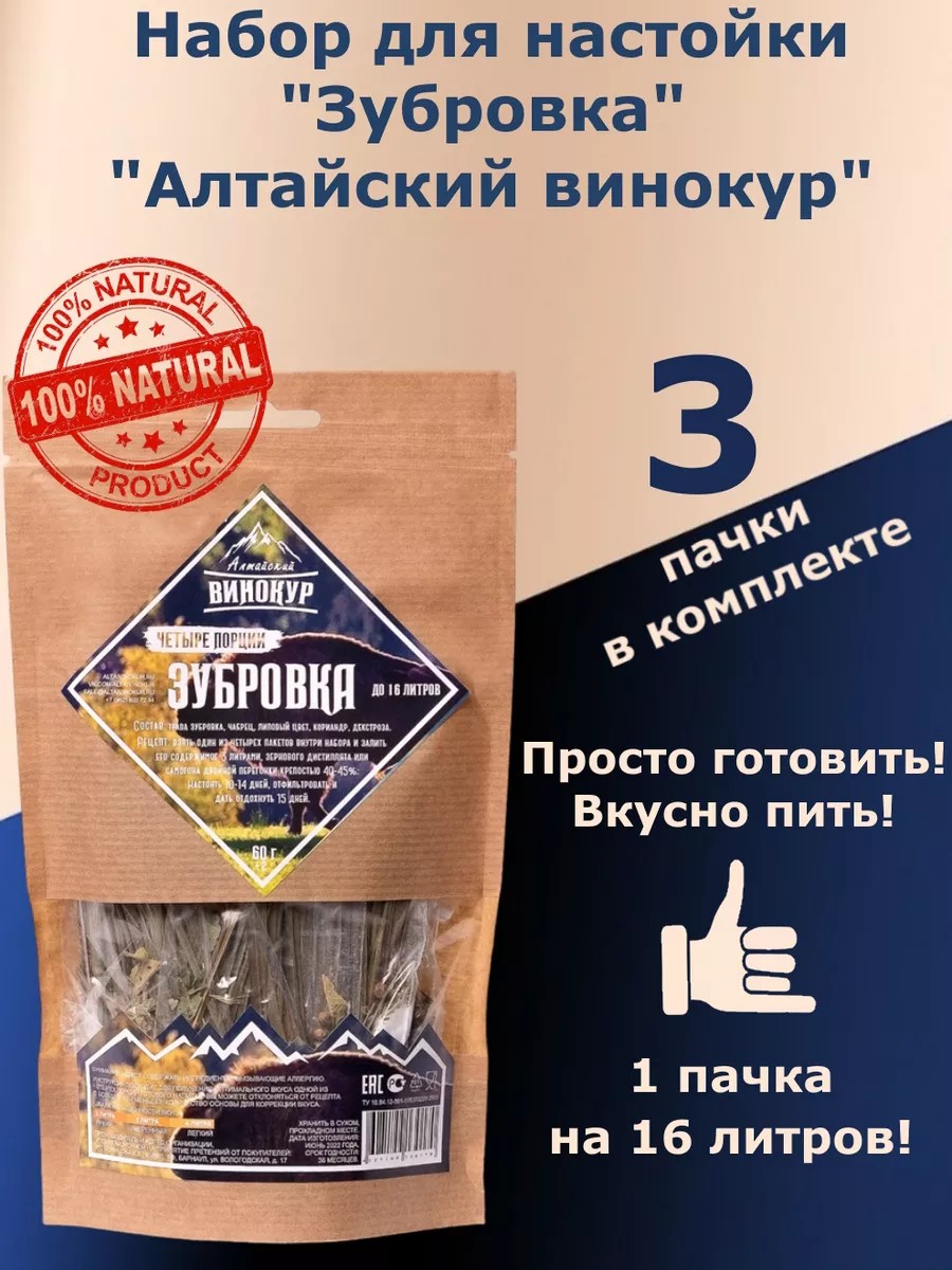 Зубровка 4в1Настойка «Зубровка 4в1» (4 порции, каждая на 4 литра) на 16 литров для самогона, водки. Мононабор трав и специй для настаивания от компании "Алтайский Винокур".Свежесть зеленого яблока с небольшим добавлением пряностей и ванили. Прямые поставки из Белоруссии ~40% об.Информация о товареЛитров в готовом напитке: до 16-и литровСостав: трава зубровка, чабрец, липовый цвет, кориандр, декстроза.Вес: 60 гр./ до 16-и литров«Зубровка» - удивительно простая и вкусная настойка. В ее основе - "Зубровка душистая", многолетняя трава, собранная вручную в Белоруссии, она обладает ароматом свежескошенной травы и зеленого яблока. Настойка относится к классу горьких настоек.Вкусовые качества:Вкус водки пряный и сладковатый, в нем прослеживаются душистые ароматы ванили и свежескошенной травы. Сладко-горький вкус придется по вкусу как мужской, так и женской части аудитории.Рецепт:1.Ингредиенты одной из четырех пачек внутри набора залить 3 литрами 40% основы (водка, самогон, разведенный спирт).2.Периодически встряхивая, настаивать в темном прохладном месте 10-14 дней. Отфильтровать и дать отдохнуть 5-10 дней.Примечания: Рекомендуем сервировать напиток с традиционными закусками, мясом, деликатесами и птицей.