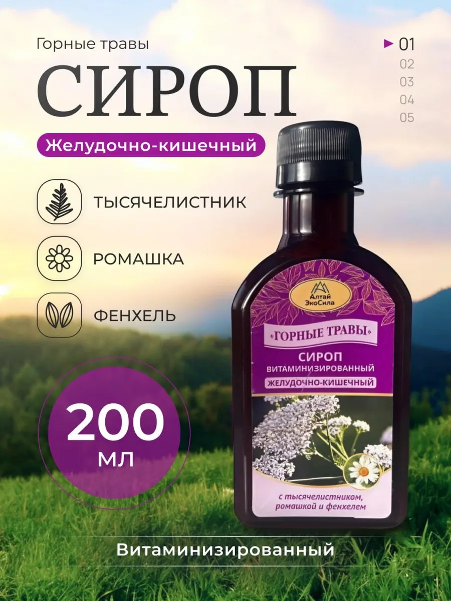 Сироп витаминизированный ГОРНЫЕ ТРАВЫ желудочно-кишечный, с тысячелистником, ромашкой и фенхелем. Рекомендуется в качестве обогащенного пищевого продукта, компоненты которого обладают противовоспалительными и противомикробными действиями, дополнительного источника витаминов С, В1, РР, В6, ВС, В12. Натуральные растительные компоненты, обладающие противовоспалительными, противомикробными действиями, совместно с витаминами, входящими в состав сиропа, нормализуют работу желудочно — кишечного тракта, устраняют метеоризм, ощущение тяжести, спазмы в желудке, улучшают пищеварение и обмен веществ. Способ применения Рекомендуемая среднесуточная норма потребления сиропа по 2 чайных ложки (10 мл) 2 — 3 раза в день во время еды. Перед применением рекомендуется растворить в небольшом количестве воды, теплом чае. Рекомендуемая продолжительность приёма — 30 дней, затем можно сделать перерыв 10 дней. При необходимости приём продолжить. Допускается наличие взвесей и естественного осадка. Перед применением взболтать. Меры предосторожности Индивидуальная непереносимость компонентов продукта.