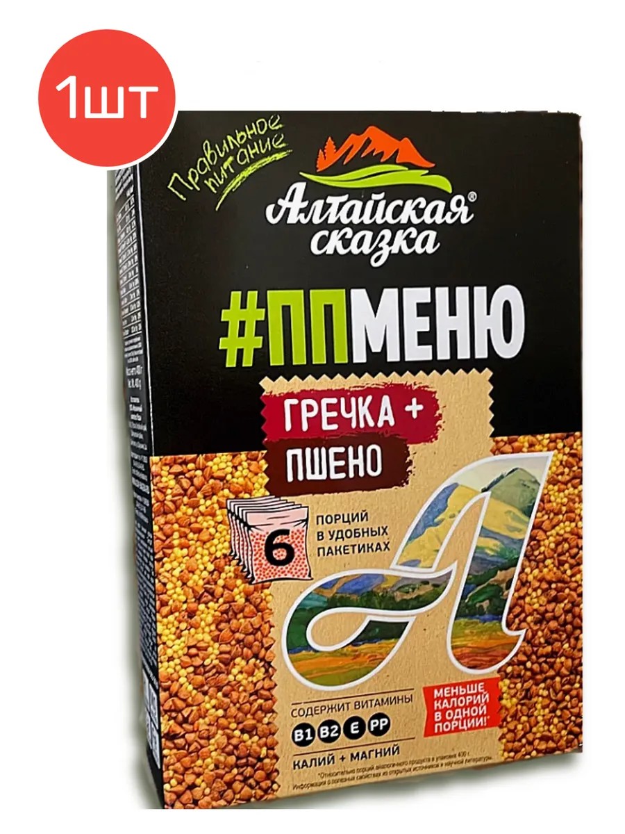 Смесь круп «Гречка+пшено» Алтайская Сказка в варочных пакетах. Очень удобно для тех, кто не любит тратить много времени на готовку, а еду предпочитает полезную. Для тех, кто придерживается здорового питания, будет эта смесь круп оценена на высший балл. Сочетание гречневой крупы и пшена обладает нежным вкусом и аппетитным ароматом. Гречка придает смеси пикантности, а пшено придает каше мягкость и легкий вкус. В состав смеси входит целый комплекс витаминов, макро-, микроэлементов и аминокислот. Железо – улучшает кровообращение и не позволяет развиться анемии; Калий – содержится в злаке в большом количестве, нормализует работу сердечно-сосудистой системы; Марганец – улучшает обмен веществ, что делает пшенную кашу полезной для полных людей; Натрий – усиливает образование желудочного сока, активирует ферменты поджелудочной железы и слюнных желез; Кремень и фтор – строительные материалы для зубов, ногтей, волос и костей, улучшают состояние кожи; Магний – повышает физическую выносливость организма и тормозит воспалительные процессы; Медь – препятствует увяданию кожи и возникновению морщин. Этот продукт обеспечивает простоту в приготовлении и минимальное количество неприятных хлопот. В каждой упаковке вы найдете 6 пакетиков, вес каждого из которых составляет 67 граммов, что делает его идеальным вариантом для быстрого и легкого приготовления. Крупа не содержит ГМО и пищевых добавок. Продукт может содержать незначительное количество глютена. На картонной коробке указана необходимая информация о составе, приготовлении.