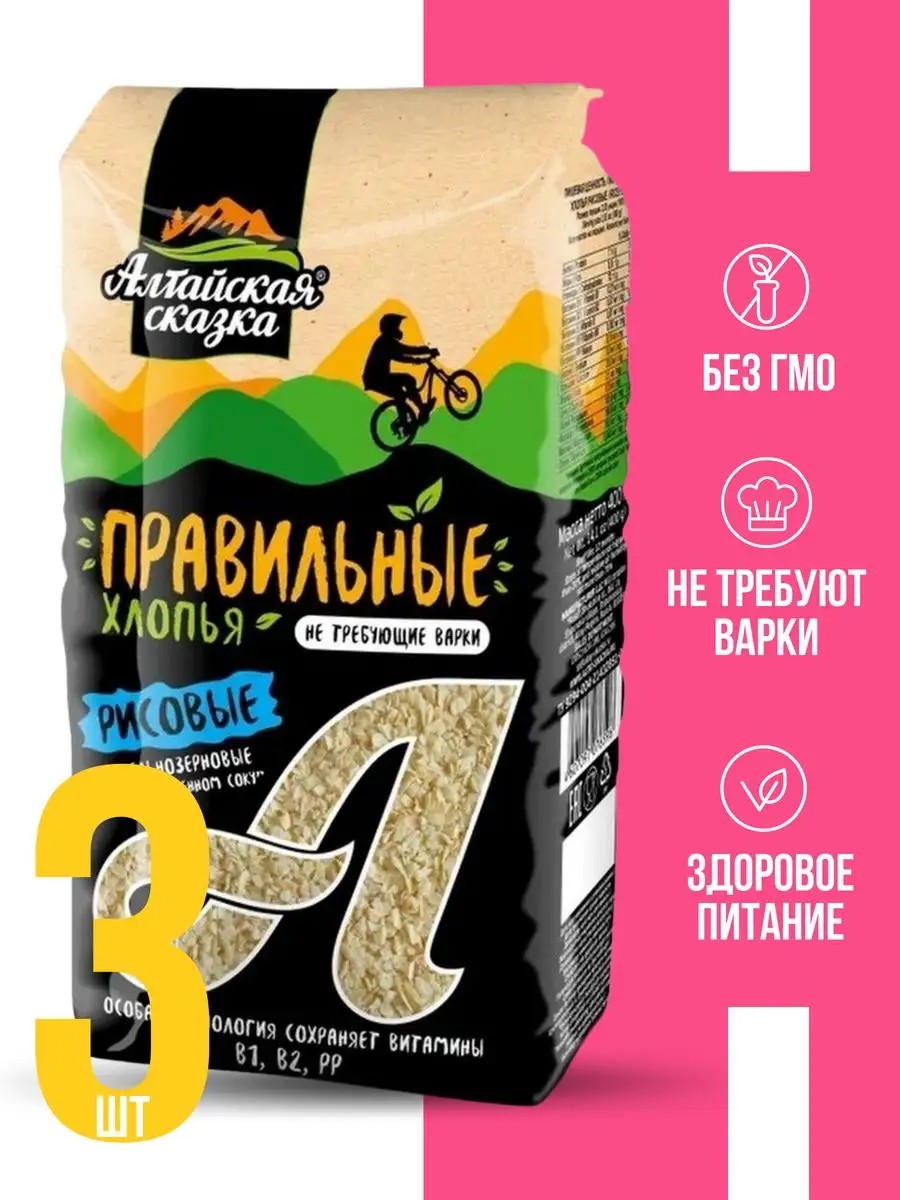 «Правильные хлопья» АЛТАЙСКАЯ СКАЗКА - универсальный продукт для вкусного и питательного завтрака, который подарит вам с самого утра чувство сытости и заряд бодрости! Диетический полуфабрикат без ГМО и ароматизаторов, соли и сахара упакован в индивидуальные пакеты, реализуется в упаковках или наборах. Натуральные хлопья: овсяные, гречневые или рисовые, пшенные или в варианте сочетания 4,5,9 злаков переработаны по уникальным технологиям, сохраняющим естественный вкус и все полезные свойства питательного продукта. Они богаты клетчаткой, витаминами и микроэлементами, минералами и аминокислотами, способствуют нормализации процесса пищеварения и поддерживают иммунитет. Полезные для общего оздоровления организма злаки для быстрого приготовления - важный источник растительного белка. Они препятствуют риску образования холестериновых бляшек, способствуют выводу токсинов и других продуктов распада, нормализуют работу кишечника, обмен веществ и способствуют похудению. При регулярном употреблении овсянки, гречихи, пшена или риса в виде хлопьев каждый день с утра или в любое время года нормализуется работа нервной и сердечно - сосудистой системы, предотвращаются отеки. Блюда из злаковых идеально и надолго утоляют голод, восполняют энергетический запас, потребность в приеме пищи возникает не скоро, что позволяет с комфортом придерживаться даже строгой диеты. Постный и веганский завтрак, обед или ужин из органических зерновых полезен в любое время года: в зимний и летний, демисезонный период (весенне - осенний). Может использоваться в качестве детского питания, полезен для женщин и мужчин, подростков - девушек и парней, придерживающихся здорового образа жизни и выбирающих продукты такого типа с невысокой калорийностью и невысоким содержанием углеводов (пищевая ценность - 70 грамм на 100 грамм зерновых). Добавляйте зерновые в любые блюда, готовьте по самым современным рецептам - вкусную и полезную еду оценит и взрослый, и ребенок!