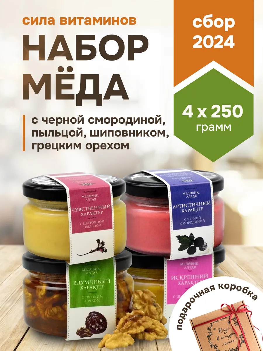 Этот универсальный подарочный набор меда — забота о близких и оригинальная альтернатива обычным сладостям. Каждый набор включает четыре баночки цветочного алтайского меда с отборными натуральными добавками: цветочной пыльцой, грецким орехом, шиповником и черной смородиной. Такой подарочный медовый набор станет прекрасным выбором, если вам нужен подарок маме на день рождения, папе, бабушке, дедушке, сестре, брату, подруге, воспитателю или учителю.