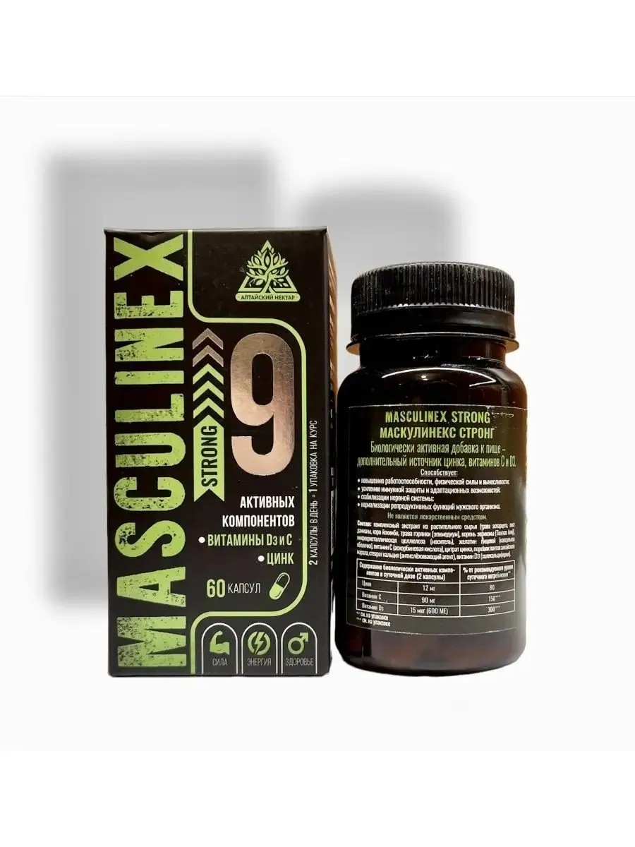 "МАСКУЛИНЕКС СТРОНГ" — натуральный стимулятор выработки тестостерона, природный анаболик, энергетик, афродизиак и иммуномодулятор. Содержит витамины, минералы и аминокислоты. Способствует повышению работоспособности, физической силы и выносливости, росту мышц, усилению иммунной защиты и адаптационных возможностей, стабилизации нервной системы, нормализации репродуктивных функций мужского организма. "МАСКУЛИНЕКС СТРОНГ" подойдёт вам, если вы искали: витамины и Бады витаминные комплексы спортивные для мужчин спортпит для спортсменов мужские средство для потенции афродизиак панты алтайского марала эпимедиум эврикома цинк витамин д3 с цинком полезные подарки для здоровья бустер тестостерона Состав: комплексный экстракт из растительного сырья (трава эспарцета, лист дамианы, кора йохимбе, трава горянки (эпимедиум), корень эврикомы (Тонгкат Али)), микрокристаллическая целлюлоза (носитель), желатин пищевой (капсульная оболочка), витамин С (аскорбиновая кислота), цитрат цинка, порошок пантов алтайского марала, стеарат кальция (антислёживающий агент), витамин D3 (холекальциферол).