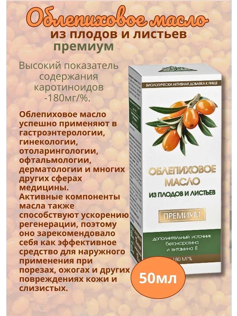 | Composition | unrefined sea buckthorn oil; oil extract from sea buckthorn leaves; (unrefined sunflower oil, sea buckthorn leaf) |