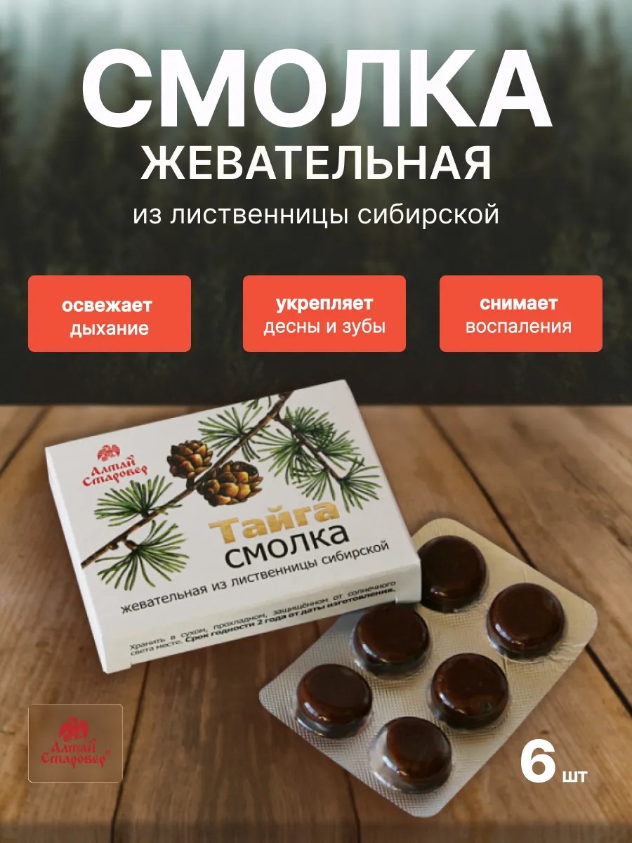 Provides oral health care, strengthens teeth and gums, refreshes and cleanses the mouth, and has anti-inflammatory, wound-healing, and restorative properties. Taiga Chewing Resin from Siberian Larch, 6 tablets