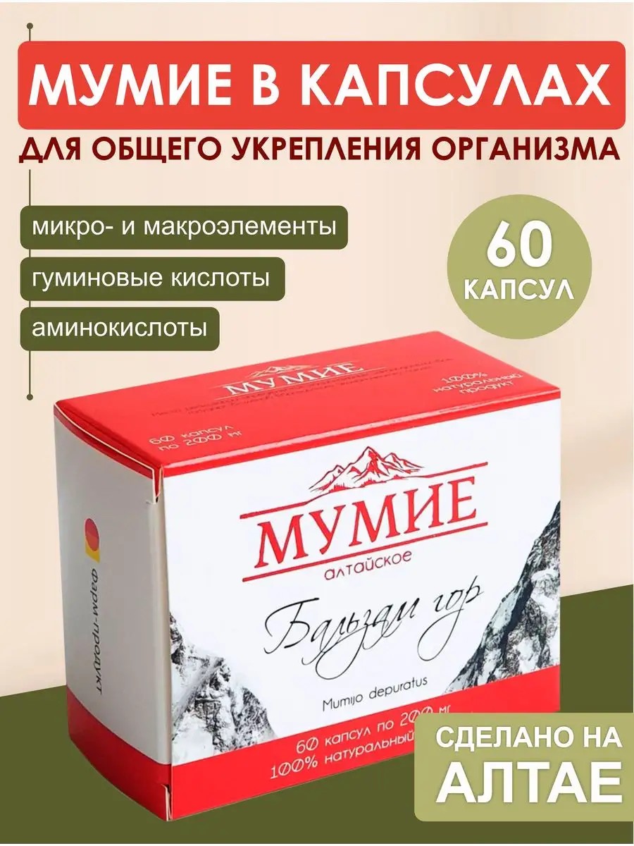 Mumiyo is one of the treasures of the Altai Mountains; it is in these pristine and protected places that the purest "mountain balm" is collected. This unique product of natural origin has absorbed the best biologically active substances: micro- and macroelements, organic and fatty acids, amino acids, proteins, and much more. The biochemical composition provides the product with a variety of properties as an effective means of restoring and maintaining the body. Some of the important substances in mumiyo are humic acids, which contribute to: increased immunity and resistance to adverse environmental conditions; protection of the body from toxic substances; increased defenses; inhibition of the growth of pathogenic bacteria in the gastrointestinal tract, stimulation of the growth of natural intestinal microflora; improved protein digestion and absorption of calcium, trace elements, and nutrients; regenerative and wound-healing effects; restoration of the mucous membrane, cartilage, and bone tissue; a beneficial effect on liver function.