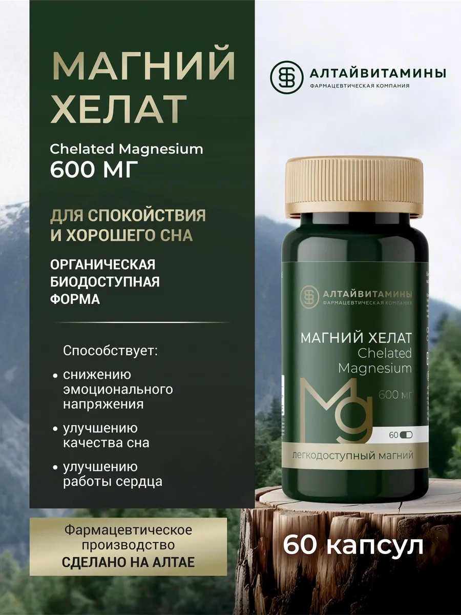 Хелат Магния (Chelated Magnesium) 600 мг — высококачественный препарат производства фармацевтической компании Алтайвитамины - биологически активная добавка, содержащая магний в хелатной форме (магния бисглицинат), которая обеспечивает увеличенную биодоступность по сравнению с другими препаратами магния. Органическая форма магния помогает снизить уровень стресса и тревожности, улучшить качество сна и поддержать работу сердца. Препарат будет полезен при симптомах хронической усталости, раздражительности, нарушениях сна, мышечных спазмах и судорогах, для здоровья сердца и костей. Подходит как женщинам, так и мужчинам, испытывающим эмоциональные и физические перегрузки, а также людям, нуждающимся в восстановлении после тренировок. Хелатная форма обеспечивает быстрое усвоение. В отличие от других форм магния, хелаты, как правило, меньше раздражают слизистую оболочку желудка и не вызывает выраженных побочных эффектов, таких как тошнота, вздутие, диарея. Препарат рекомендуется принимать по 2-3 капсулы 2 раза в день во время еды, курсом 30 дней, при необходимости прием препарата можно повторить. Продукт особенно актуален для тех, кто ищет эффективное средство от стресса, витамины с магнием в капсулах, таблетки для улучшения сна, добавки для укрепления нервной системы. Может применяться в период активной умственной и физической работы, при диетах, а также в профилактике сердечно-сосудистых нарушений. Хелат магния — это современный подход к восполнению одного из важнейших микроэлементов в организме. Перед использованием добавок с медью или другими микроэлементами рекомендуется проконсультироваться с врачом или специалистом в области питания, чтобы обеспечить правильную дозировку и избежать потенциальных побочных эффектов.