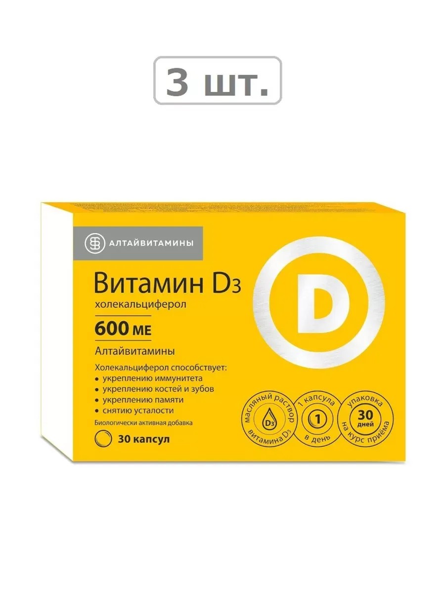 витамин d3 (холекальциферол) 600ме алтайвитамины n30 капс по 240мг. Состав: масло подсолнечное рафинированное, оболочка капсулы (желатин, агент влагоудерживающий - глицерин, эмульгатор - сорбит, вода очищенная), витамин Д3, антиокислитель - смесь токоферолов, комплексная пищевая добавка (антиокислители: лецитин, аскорбилпальмитат, альфа-токоферол)