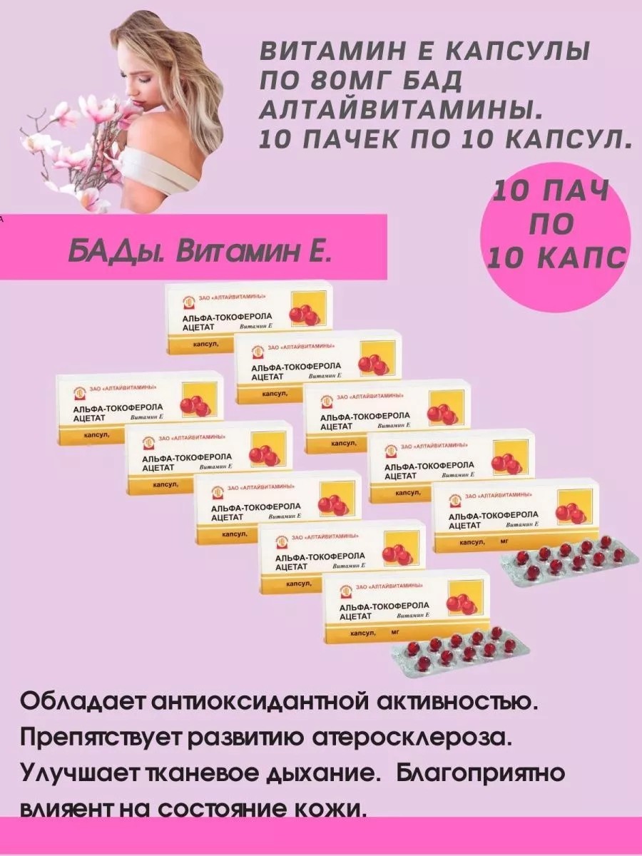 Витамин Е капсулы по 80мг БАД Алтайвитамины в одной упаковке 10 капсул. Ацетат токоферола восполняет дефицит витамина Е. Обладает антиоксидантной активностью. Участвует в процессах тканевого метаболизма, предупреждает гемолиз эритроцитов, предотвращает повышение проницаемости и ломкости капилляров, нарушение функции семенных канальцев и яичек, плаценты, нормализует репродуктивную функцию. Препятствует развитию атеросклероза, дегенеративно-дистрофических изменений в сердечной мышце и скелетной мускулатуре. Улучшает питание и сократительную способность миокарда, снижает потребление миокардом кислорода. Тормозит свободнорадикальные реакции, предупреждает образование пероксидов, повреждающих клеточные и субклеточные мембраны.Стимулирует синтез гема и гемсодержащих ферментов - гемоглобина, миоглобина, цитохромов, каталазы, пероксидазы. Улучшает тканевое дыхание. Тормозит окисление ненасыщенных жирных кислот и селена. Ингибирует синтез холестерина.