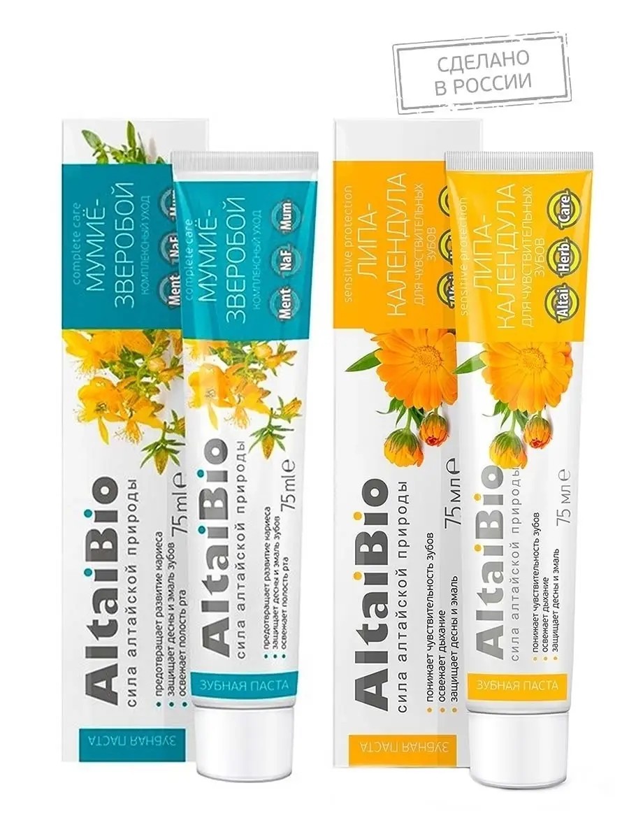 Give your smile natural care and protection with a unique set of toothpastes from AltaiBio! This set combines the power of nature and modern technology, providing comprehensive care for your teeth and gums. Mumiyo-St. John's Wort Toothpaste: Altai mumiyo promotes tissue regeneration, wound healing, and strengthens gums. St. John's wort, hops, plantain, and chamomile extracts protect gums, have an anti-inflammatory effect, and prevent cavities. Sodium fluoride strengthens tooth enamel, increasing its resistance to acids. Linden-Calendula Toothpaste: Linden extract has anti-inflammatory, bactericidal, and wound-healing properties. Calendula extract strengthens gums, improves tissue regeneration, and has an antiseptic effect. Sodium fluoride protects teeth from cavities by strengthening enamel. The benefits of our kit include comprehensive care: it prevents cavities, strengthens gums, and protects enamel. Natural extracts: hops, St. John's wort, plantain, chamomile, linden, and calendula provide gentle care and protection. Altai mumiyo: A unique component that promotes healing and regeneration. Safety and effectiveness: suitable for daily use by the whole family. Recommendation: For maximum effect, use the toothpastes in combination with AltaiBio mouthwash. This kit will be loved by those who value natural ingredients and gentle care, those who care about the health of their gums and teeth, and those looking for an effective solution to prevent cavities and inflammation. How to use: Apply a small amount of toothpaste to your brush and brush your teeth for 2-3 minutes. Use twice a day to maintain oral health. Give yourself and your loved ones the gift of care with the AltaiBio toothpaste set! The power of nature and modern technology—your path to a healthy and beautiful smile!