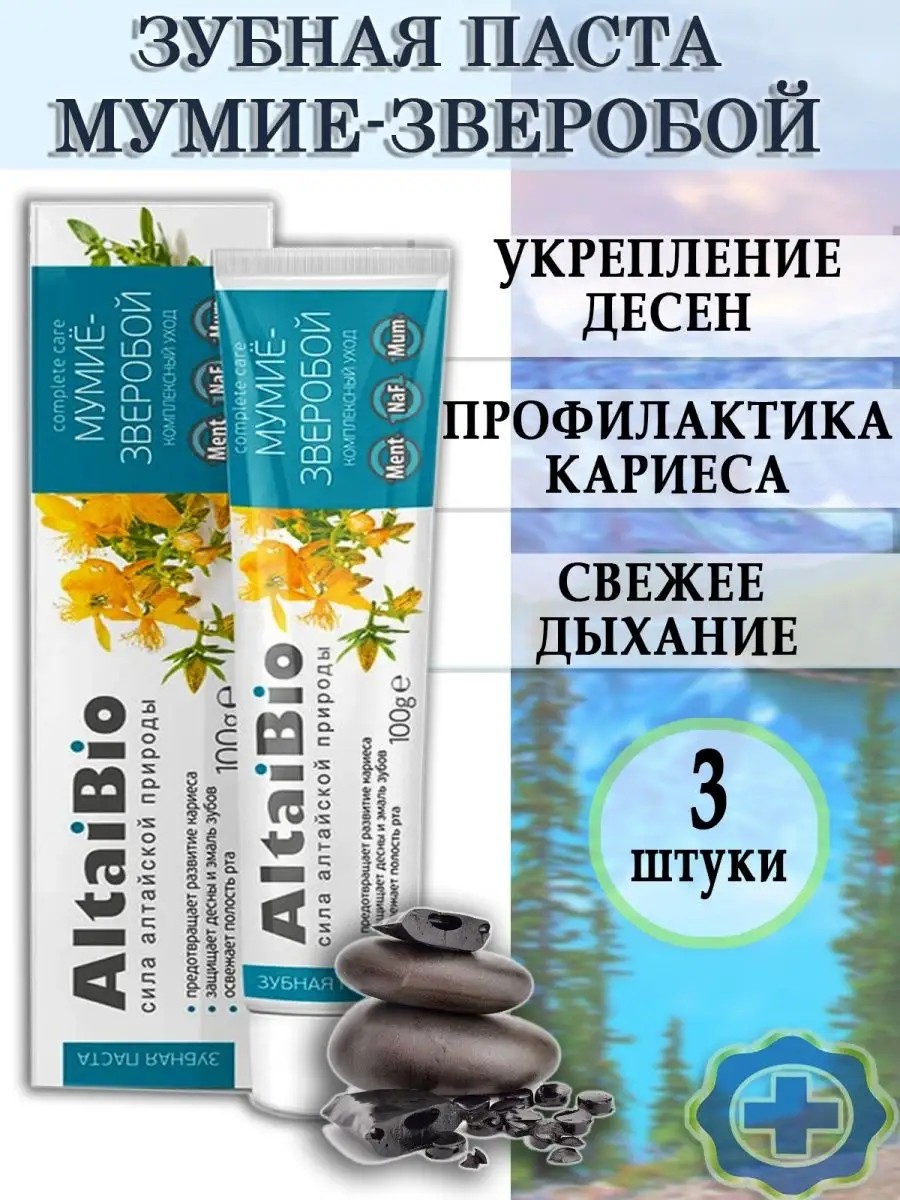 AltaiBio "Mumiyo-St. John's Wort" toothpaste with mumiyo and St. John's wort extract for comprehensive oral care, preventing cavities and strengthening gums. It has antiseptic and anti-inflammatory properties and is very refreshing. Altai mumiyo has anti-inflammatory, antibacterial, and wound-healing properties. St. John's wort has an astringent, antiseptic effect, and stimulates tissue regeneration. Hops have anti-inflammatory and healing properties. Colloidal silver is a powerful antibacterial agent that helps restore damaged tissue, destroy old cells, and relieve inflammation. Silicon dioxide has a high cleansing ability, cleans away pigments and plaque, and prevents their formation. Sodium fluoride prevents the development of caries by increasing enamel resistance and inhibiting the production of acids by plaque bacteria. Volume: 75 ml.