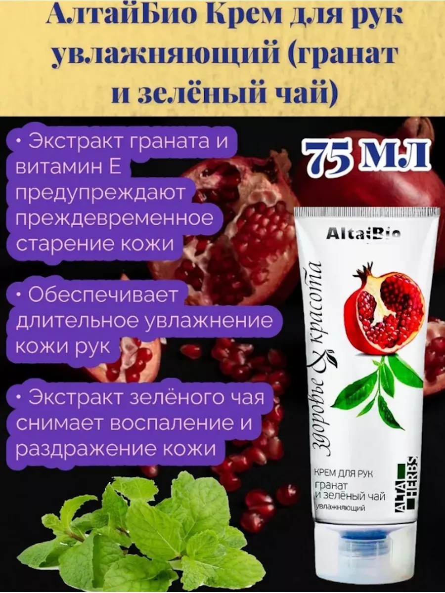 Крем для рук AltaiBio ("Гранат и зеленый чай. Увлажняющий)- быстро впитывается, образуя на коже тонкую защитную плёнку, обладающую водоотталкивающим эффектом. Крем для рук не нарушает природный водно-жировой баланс кожи. Натуральные экстракты, входящие в состав крема, смягчают кожу, сохраняют влагу в клетках кожи, надежно защищают от негативных внешних воздействий. Подробную информацию о составе и свойствах каждого вида зубной пасты можно посмотреть на фото. Будем очень признательны за Ваши отзывы. Ваше мнение помогает нам становиться лучше и делать еще больше для Вас и Вашего здоровья. Давайте совершенствоваться вместе!