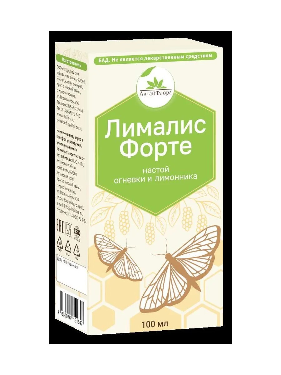алтайфлора лималис форте настой огневки пчелиной с лимонником 100мл флак. источник схизандрина и витамина с. в качестве биологически активной добавки к пище. вода, плоды лимонника, экстракт огневки пчелиной, аскорбиновая кислота, бензоат натрия (консервант). рекомендуется взрослым в качестве биологически активной добавки к пище, источника схизандрина и витамина с.