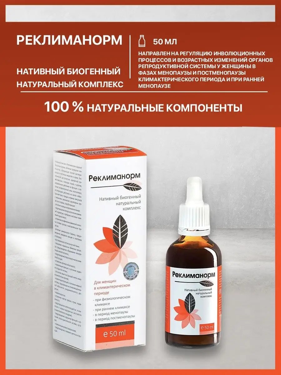 Натуральный комплекс на основе нативных концентратов органелло-структур растений и природных компонентов, направленный на регуляцию инволюционных процессов и возрастных изменений органов репродуктивной системы у женщины в фазах менопаузы и постменопаузы климактерического периода и при ранней менопаузе (до 45 лет), вызванной стресс-факторами и воздействием внешних и внутренних неблагоприятных условий. **Способ применения:** принимать по 10 капель, разведённых в 50 мл воды (3 столовых ложки), на голодный желудок 2 раза в день - утром и вечером. Курс приёма 30 дней. Рекомендуется 3 курса в год.